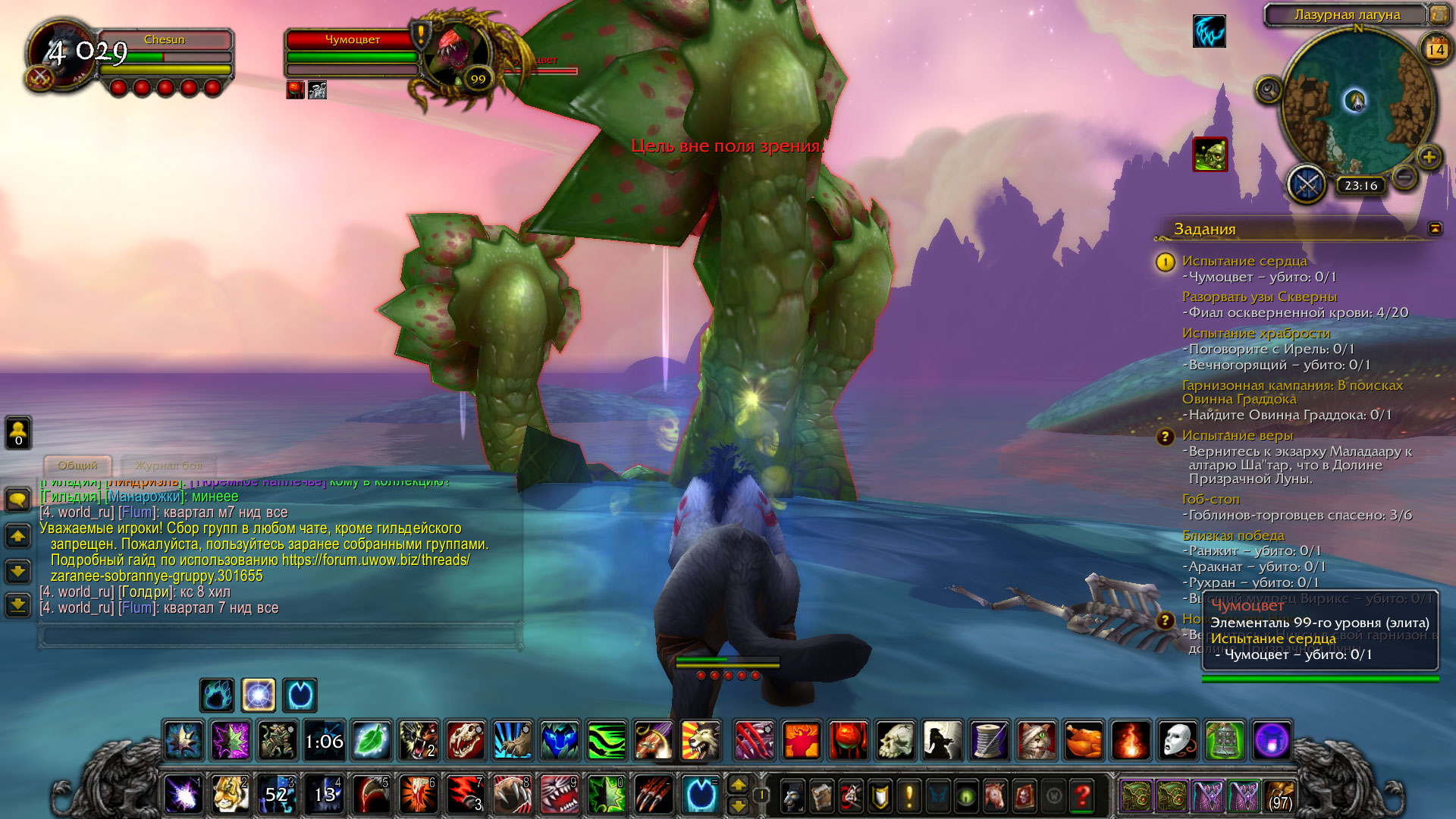 Descriptionсобственно когда берешь квест прилетаешь в Награнд и начинаешь атаковать NPC "Чумоцвет" пишет Цель вне поля зрения.