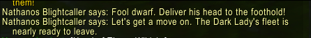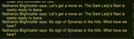 | Description | Before picking up the quest, two Nathanos Blightcaller are spawned and both of them say the wrong quote before proceeding with the correct one (see the first attached file). After getting the head of Thane Wildsky, that same quote is said by Nathanos (see the second attached file). | ||||