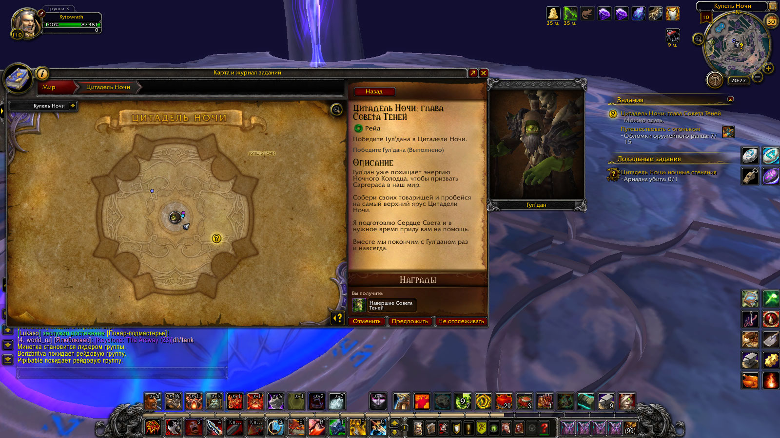 | Description | По квесту: Цитадель Ночи: глава Совета Теней(https://ru.wowhead.com/quest=45417/%D1%86%D0%B8%D1%82%D0%B0%D0%B4%D0%B5%D0%BB%D1%8C-%D0%BD%D0%BE%D1%87%D0%B8-%D0%B3%D0%BB%D0%B0%D0%B2%D0%B0-%D1%81%D0%BE%D0%B2%D0%B5%D1%82%D0%B0-%D1%82%D0%B5%D0%BD%D0%B5%D0%B9).Требуется убить NPC Гул'дан. Что я и сделал. | ||||