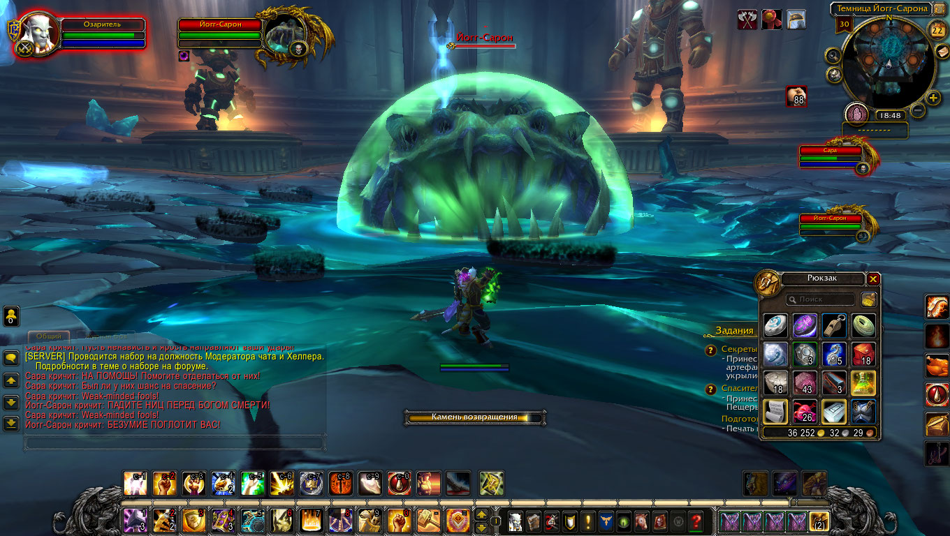 | Description | Начал бой с Йогг-Сароном убил первую пачку щупалец, потом вторую, после чего он забагался, не создавал порталов и щупалец, и просто стоял неуязвимым. | ||||