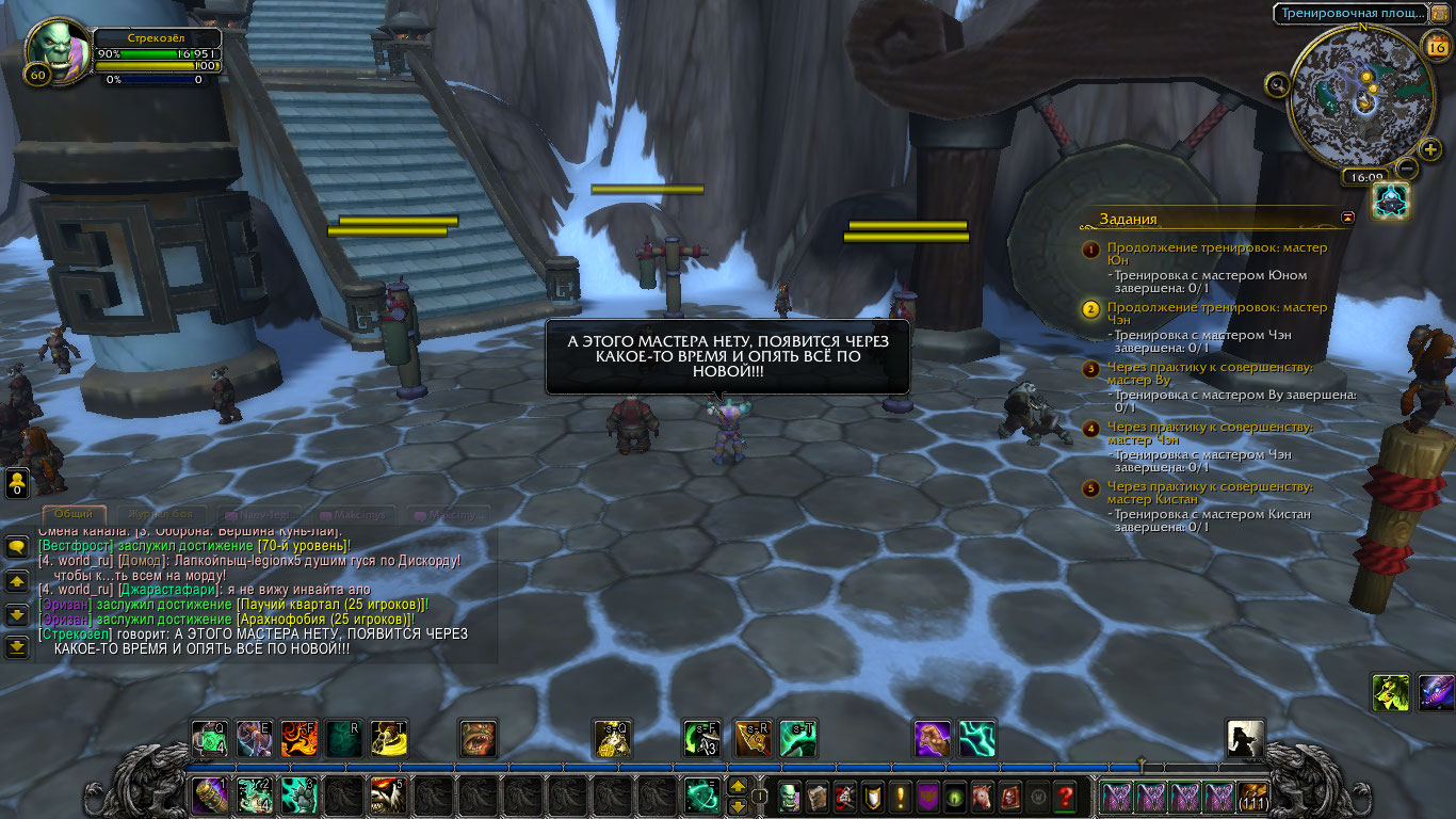 | Description | На вершине Кунь-Лай тренировочная площадка монахов. Задания не выполняются, после разговора с мастером, пропадают все NPC, что союзные, что враждебные по всему миру. Появляются только после смены специализации, а задания так и не выполняются. | ||||