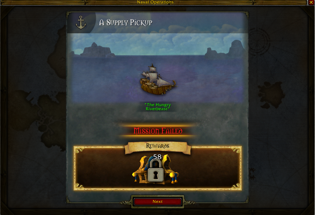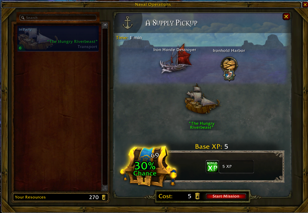 | Steps To Reproduce | 1. Take www.wowhead.com/quest=39056/naval-commander 2. Approach the Naval Flee Table, click on the only available mission on the map https://www.wowhead.com/mission=637/a-supply-pickup 3. Drag the only available ship to its place and start the mission 4. After a minute it fails with a 0% chance of success and disappears off the map | ||||