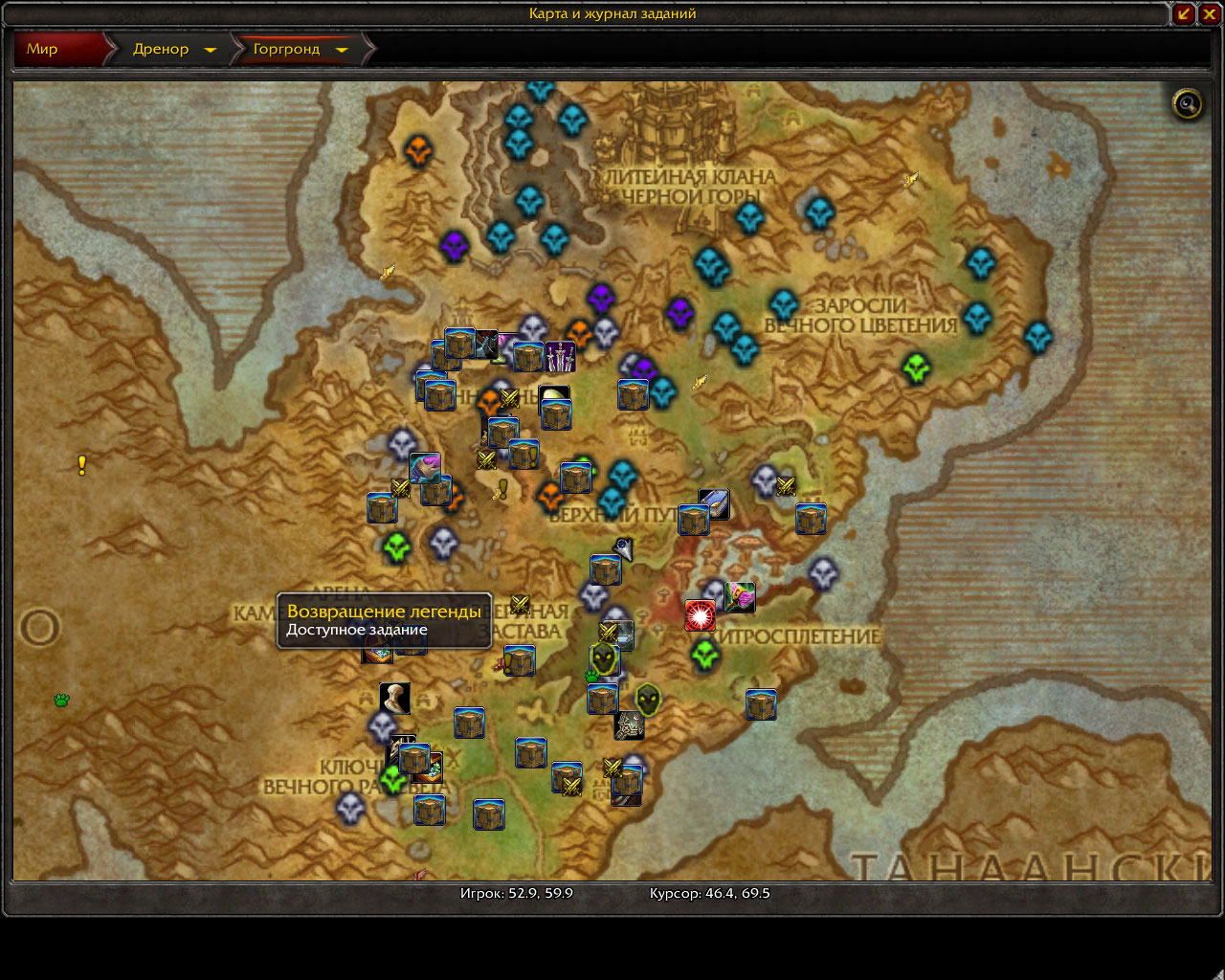 | Description | Достижение https://www.wowhead.com/ru/achievement=8924/горы-горя-в-горгронде 3 цепочка квестов "Поддержка гарнизона" - НПС не начинает квест https://www.wowhead.com/ru/quest=34697/возвращение-легенды. Фракция - Орда. Квест необходим для ачивы -https://www.wowhead.com/ru/achievement=9923/хранитель-мудрости-дренора | ||||
