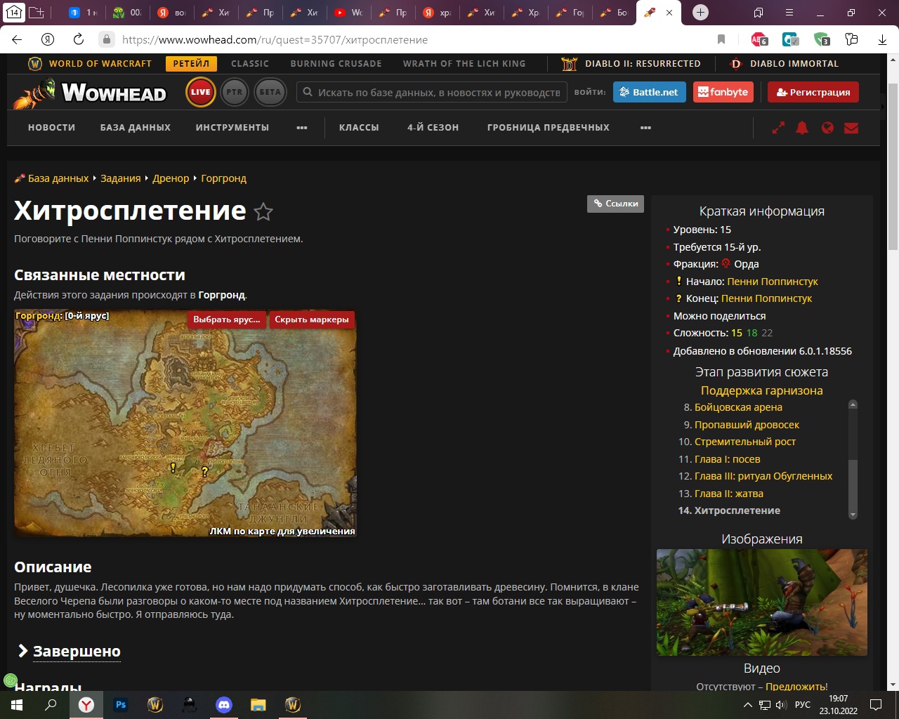 Хорошо, хотелось по-хорошему, будем как обычно, ковыряться в этом как можно дольше. Давайте еще раз. Фракция Орда, Ачива - https://www.wowhead.com/ru/achievement=8924/горы-горя-в-горгронде Раз вы считаете что кв https://www.wowhead.com/ru/quest=35707/хитросплетение - цепочка на главу "Поддержка гарнизона", и даже не перешли по ссылке и не открыли вовхед, чтобы посмотреться, то давайте разбираться. Открываем и смотрим, что КВ https://www.wowhead.com/ru/quest=35707/хитросплетение у Орды мало того, что последнее в этой цепочке (1), оно еще и начинается само, игнорируя предквесты, окей. По завершению этого задания, ничего не засчитывается, цепочка как висела - не выполненная, так и висит (2). За то, по карте мы видим что начальные КВ этой цепочки есть, только у НПС их нет (3). Хорошо, предположим, что на разные здания - разные КВ, не понятно правда почему на других локациях все цепочки идут по вовхеду, ну да ладно. Вот сейчас финальное КВ - сделано, но результата - ноль. Я настаиваю на решение и проверки бага, так как, такая песня у всех гильдии. Все скрины прикложу. |