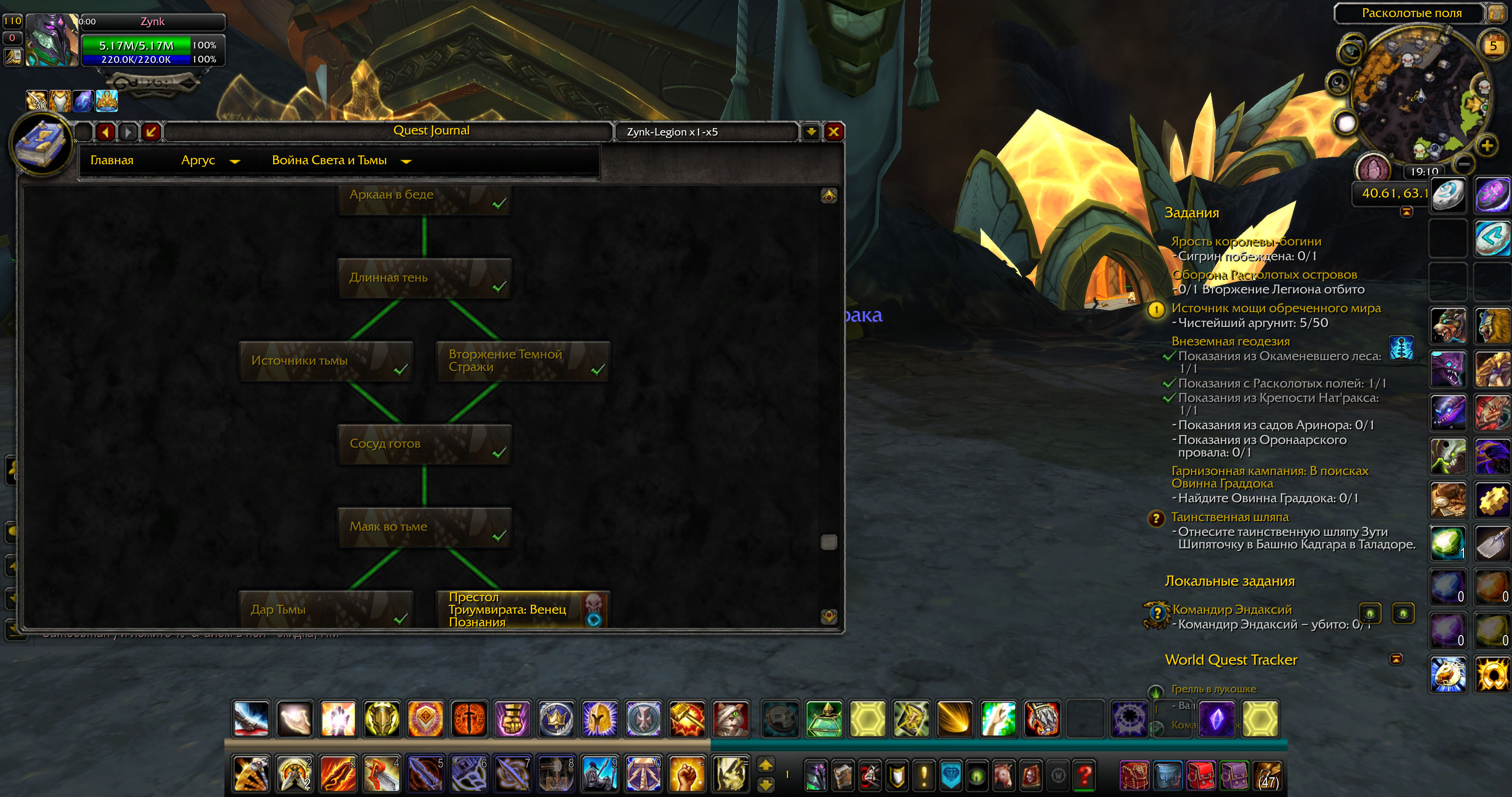 вот игровой процесс на аргусе. Висит квест Престол Триумвирата: Венец Познания. По квесту этому не могу скинуть прогресс и взять его заново. По квесту Крепость Натракса Приготовление идет очень медленный набор опыта для повышения уровня 6 защитников. Квест Обеспечение крокуна не работает. Он давался автоматом и кому его сдавать я не знаю. Выполнена цепочка Наступление началось с переходом на цепочку Всаднки. Выполнена цепочка Темное Пробуждение полностью. В цепочке воины света висит квест Престол Триумвирата: Венец Познания. |