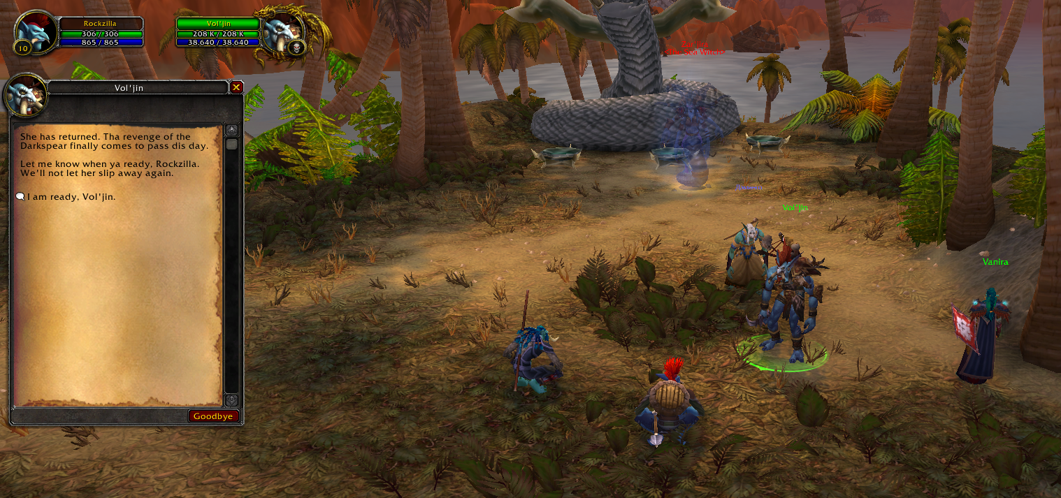 | Steps To Reproduce | When you complete the step before with the troll masks and the naga in the cave you have to kill, on completion you get the next step to speak to Vol'Jin. This step works, but after you spoke to him it seems the speech bubble "I'm Ready, Vol'Jin" doesn't work and doesn't start the event as normal where he talks and then attacks the Naga queen. | ||||