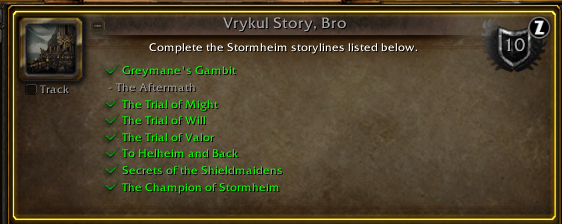 | Description | Stormheim storyline achievement called "Vrykul story, Bro" has a storyline called "The aftermath". I have completed all required storylines for this and it is mark as not completed. I have done other storyline quest and all other storyline is completed except this one. "The aftermath". I don't think you will be able to progress before completing this storyline as it is one of the first storyline connecting to next storyline for "Vrykul story,bro" . Thus, the achievement should be marked as completed and i did not gain it. Please look into this. | ||||