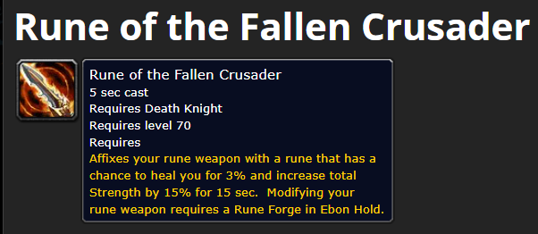 | Description | Death Knights Runeforged weapon enchant " Fallen crusader ", Does not proc/ happen inside of arenas and battle grounds Зачарование для оружия Рыцарей Смерти, выкованных рунами, «Падший крестоносец». Не срабатывает/не происходит на аренах и полях сражений. | ||||