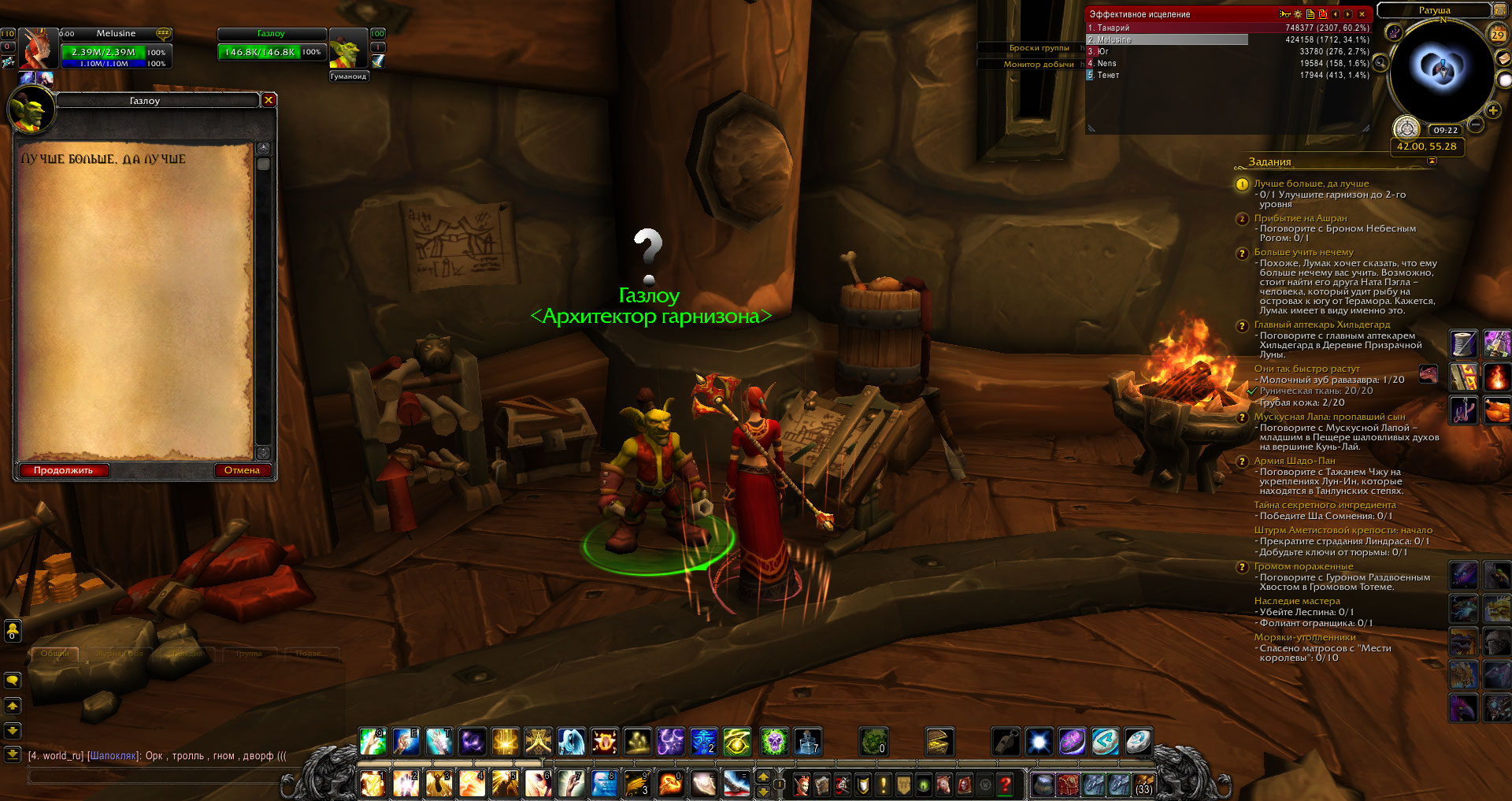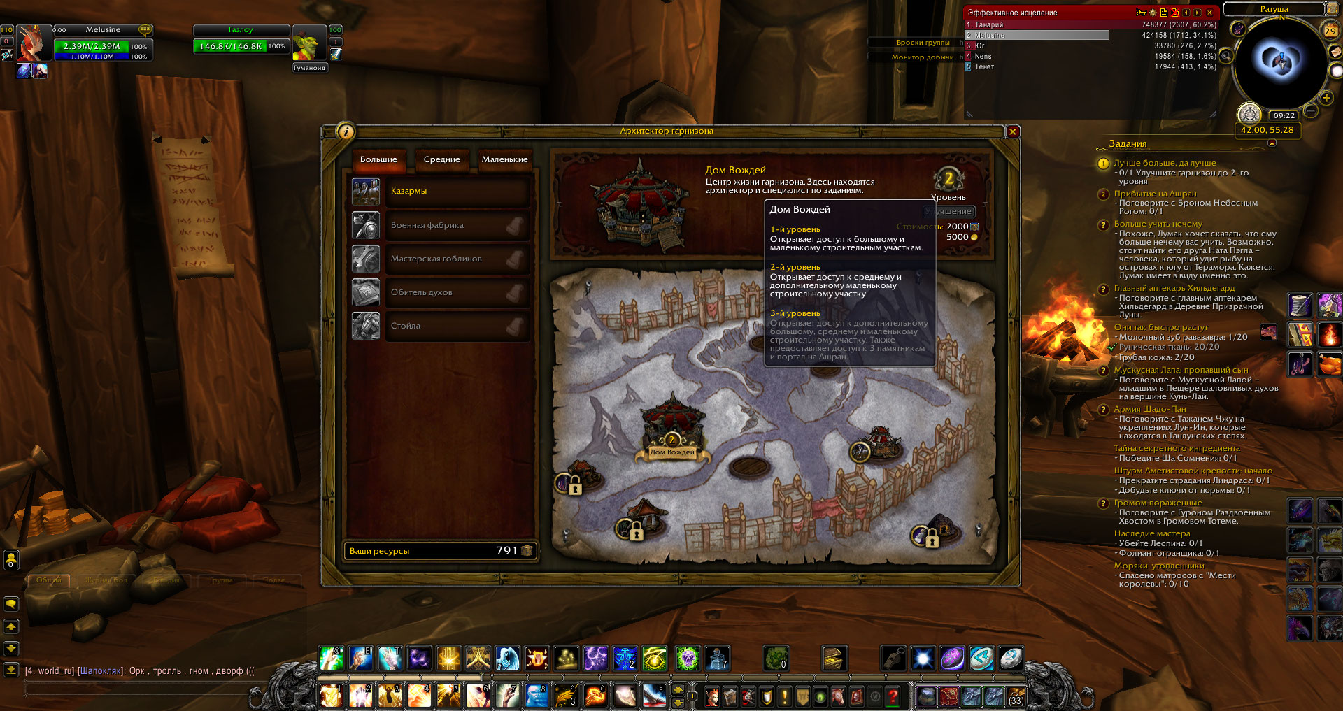 | Description | Подойдите к столу архитектора, чтобы выбрать ратушу и улучшить ваш гарнизон до 2 уровня. Квестодатель: Газлоу <Архитектор гарнизона> Награды: Книга чертежей гарнизона Гарнизон улучшен до 2-ого уровня, но квест сдать не могу. | ||||