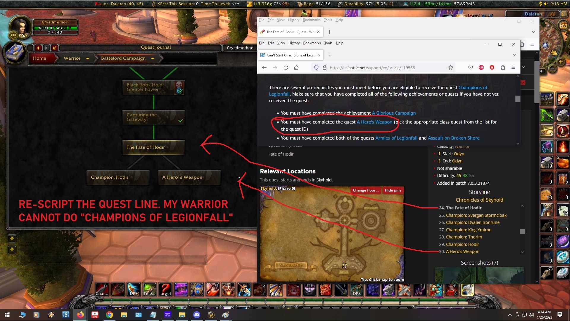 You've got your quests out of order. Fix it for warriors. https://us.battle.net/support/en/article/119568 Look at the quest storyline on the right. https://www.wowhead.com/quest=42974/the-fate-of-hodir How am I supposed to do "Champions of Legionfall" when "The Fate of Hodir" comes BEFORE "The Fate of Hodir" in the questline??? This bug is now severe, and not high priority. FIX IT. Re-Script the questing. |