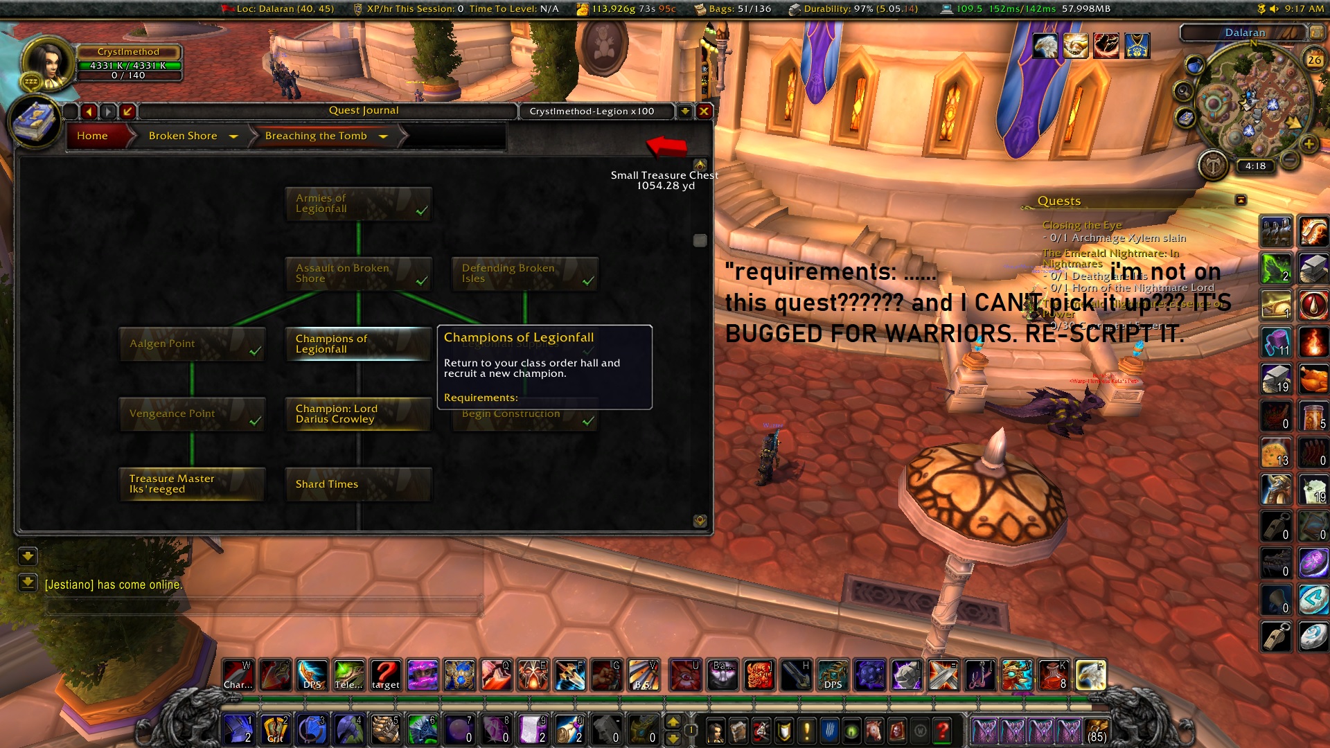 Warrior Campaign / Broken Shore for Warriors NEEDS to be re-scripted. All people ever care about is their stupid mythics, nobody ever actually cares to quest. |