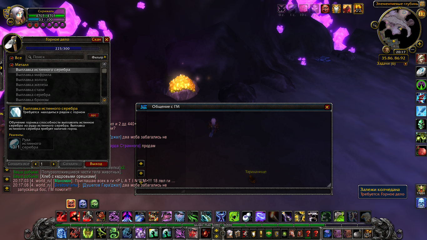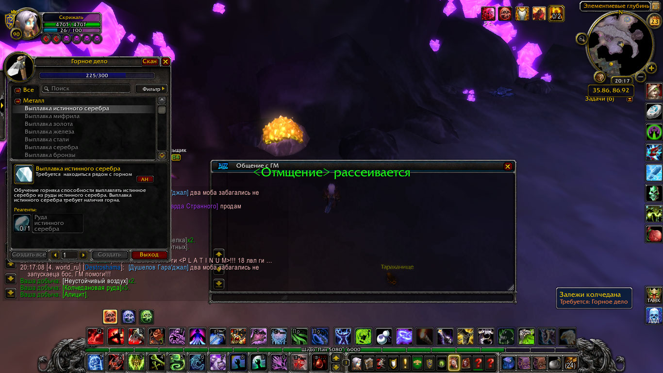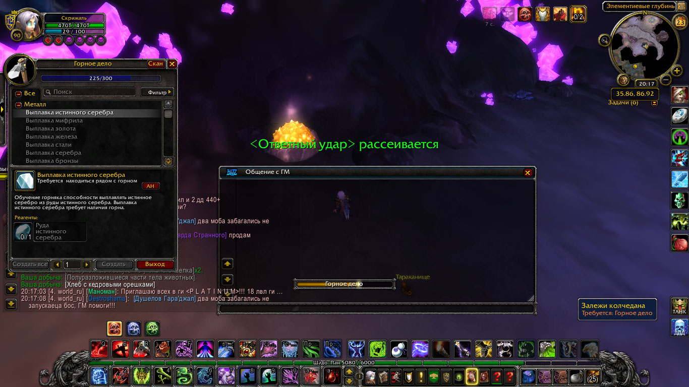 | Description | Здравствуйте! Сообщаю об ошибке в профессии Горное дело. Навык перестал подниматься при выкапывании руды. На прикрепленных скриншотах видно окно профессии в котором выплавка металлов перестала поднимать навык. Также на этих скриншотах я выкапываю колчедановую руду, которая значительно превосходит текущий уровень и гарантированно должна повышать навык, но этого не происходит. Следующая выплавка металлов становится доступна на 230 уровне, в то время как отметка профессии остановилась на 225 и не поднимается дальше. Таким образом не представляется возможным прокачать эту профессию дальше. |