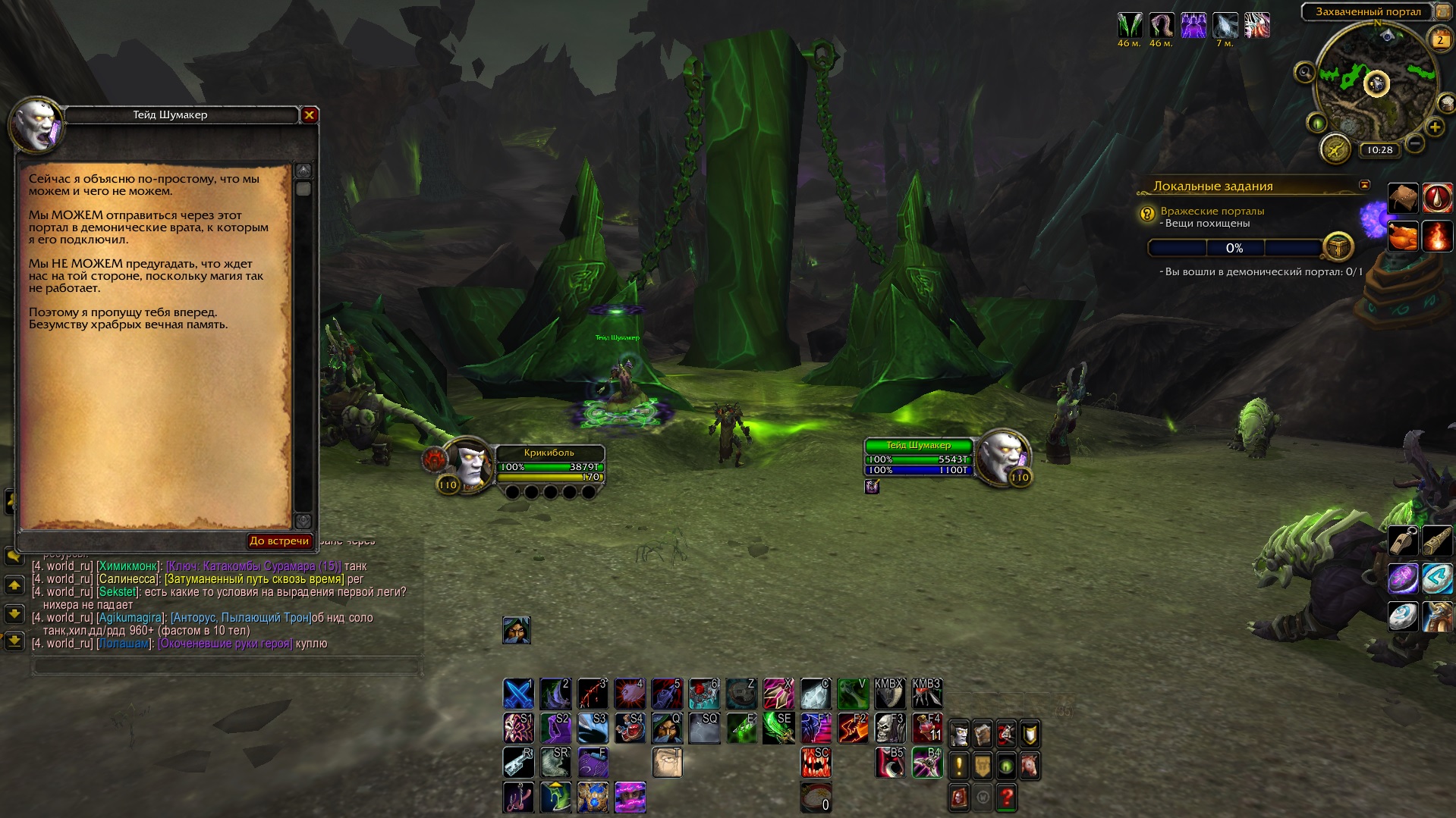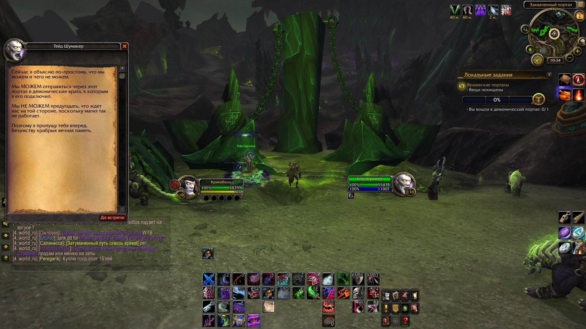 | Description | Не работает локалка "Вражеские порталы" quest=45542. Отсутствует сам портал, что обрывает выполнение кв (см. скрины). Этапы выполнения по вовхеду: - Вы вошли в демонический портал - Поговорите с Тейдом, чтобы получить маскировку - Вещи похищены - Жизненно важные припасы (10) | ||||