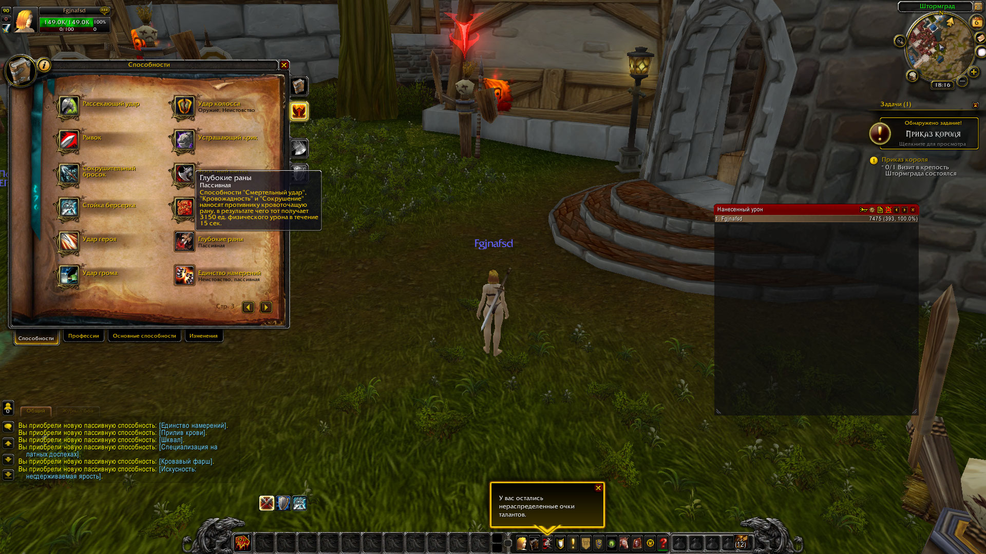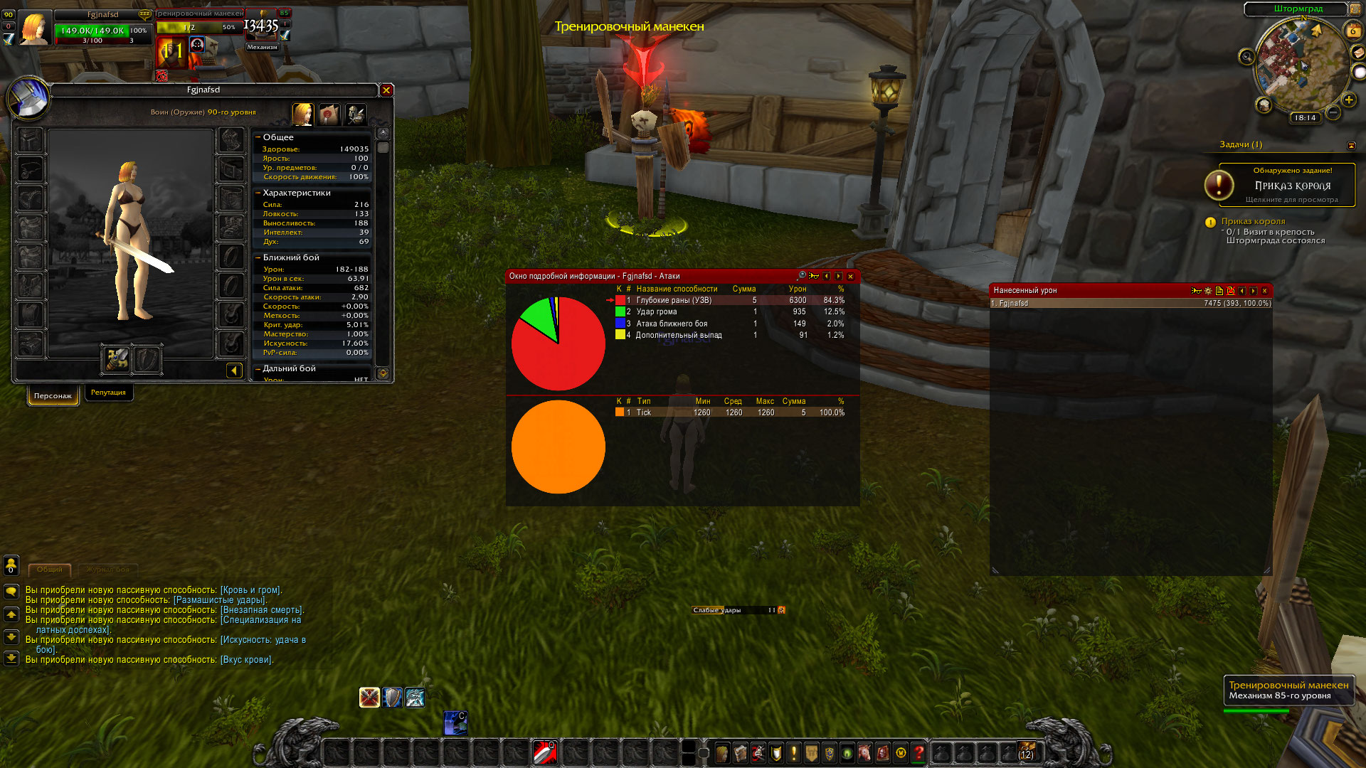Как работает на другой пиратке меня (как и разраба) не интересует. Заходите сюда https://web.archive.org/web/20140727145412mp_/http://ru.wowhead.com/spell=115768 берёте формулу "1800 (+ 198% of Attack power)", смотрите на кол-во статы "Attack Power" у себя и считаете в спеке фурика: У меня на тесте было 63616 ед. AP и общий урон (за все тики) у пасивки 115768 составляет = 127760 ед. 1800 + 62343 (это 98%) + 63616 (это оставшиеся 100%) = 127759 ед. всего урона за 15 сек. А теперь делите это число на 5 (количество тиков за весь период доты 115767), получается - 25551 ед. урона за тик (по нпс). 5876 ед. урона будет уже по игроку с 77% пвп устойчивости. 11497,95 ед. урона будет уже по игроку с 55% устойчивости (на х5 сервере). Так как там в данный момент 55% устойчивости. Армс: Тут уже всё просто, умножаете предыдущие показатели на 2 (ап урона у доты на 100%) и получаете урон по плееру (без учёта мода на +25% урона с спека): С 77% устойчивости = 11752 ед. урона за тик. С 55% устойчивости (х5 сервер) = 22995,9 ед. урона за тик. |