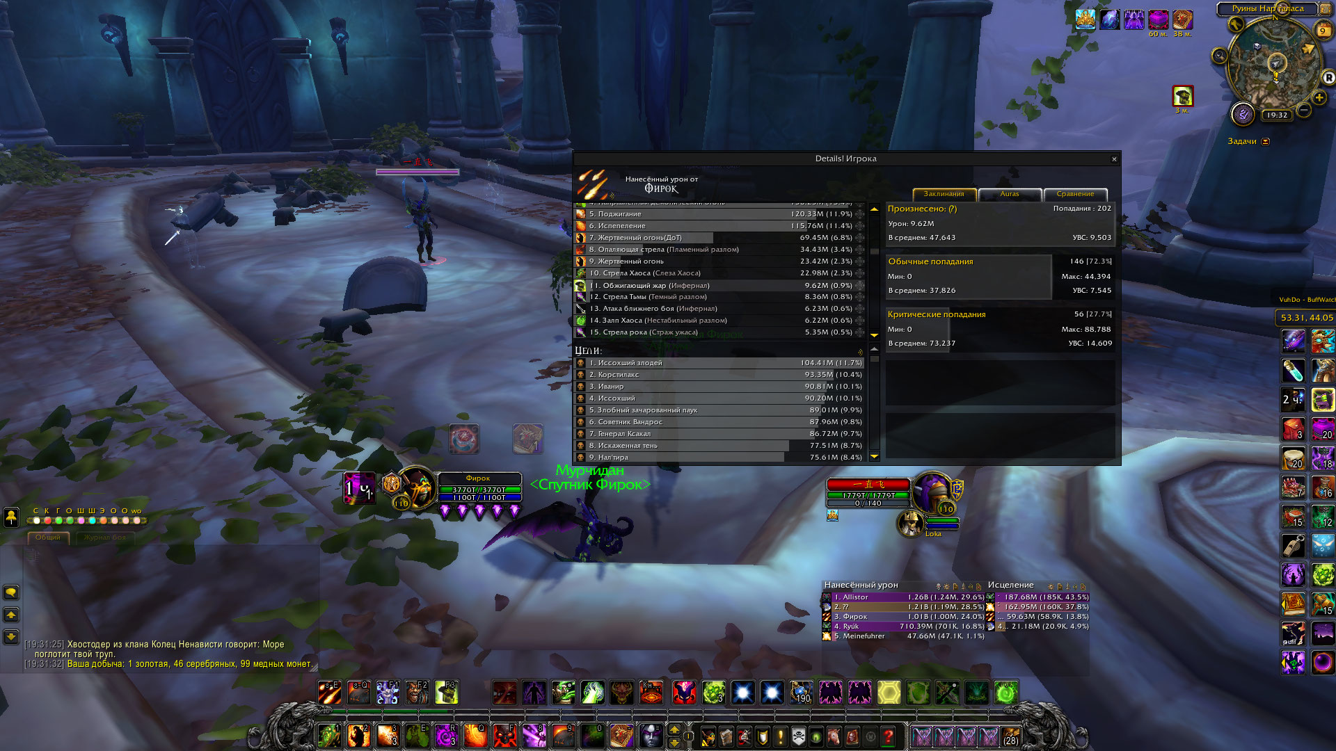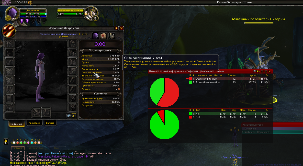 по поводу первого комента вашего,я играю на легион x5 по поводу 2-го это урон оверол за фул инст 1.4% (мейн абилка варлока) которая юзается раз в 3 минуты и с фул инферналами 10 минут! и 3-е куда выше одеваться?у меня илвл уже 913 фул гир кованный титанами! |