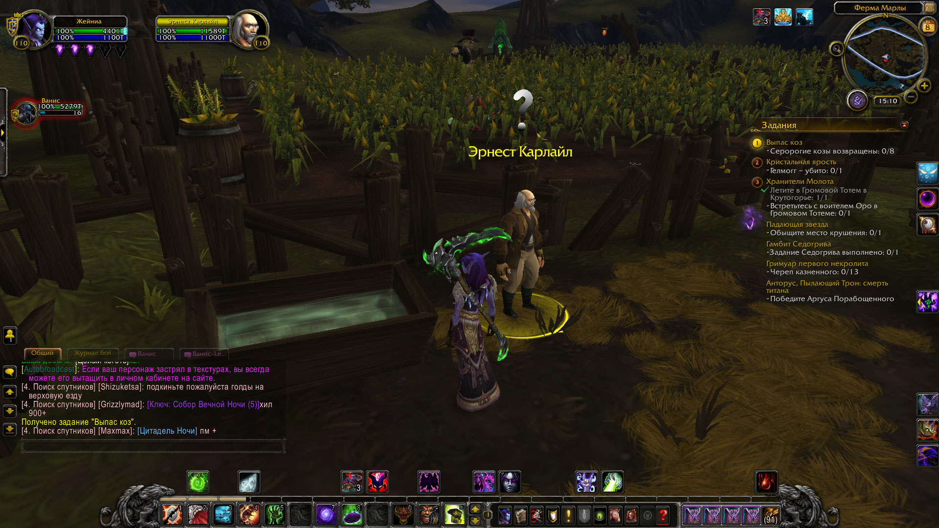 | Additional Information | Скрины были сделаны в одно время разными персонажами. У Чернокнижника "Жейниа" отсутствуют НПС "Серорогие козы", которые необходимы для выполнения задания, в то время как у Рыцаря Смерти "Ванис" НПС "Серорогие козы" присутствуют. | ||||