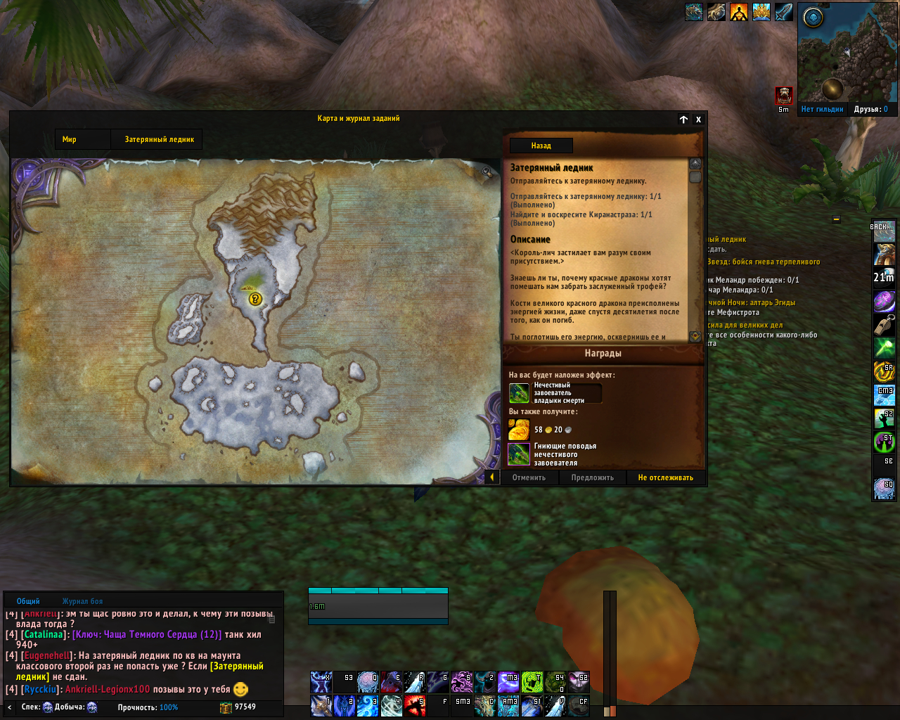 | Description | Во время того как Я выполнял последний этап квеста "Затерянный ледник" на классового маунта рыцаря смерти мой компьютер выключился по тех. причинам и после его включения и входа в игру мой Дк оказался в таверне. Квест "Затерянный ледник" выполнен но не сдан и отменить его нельзя, повторно попасть в сценарий на ледник Я не могу. Пожалуйста прошу засчитать мне данный квест или телепортировать моего персонажа в сценарий на ледник. | ||||