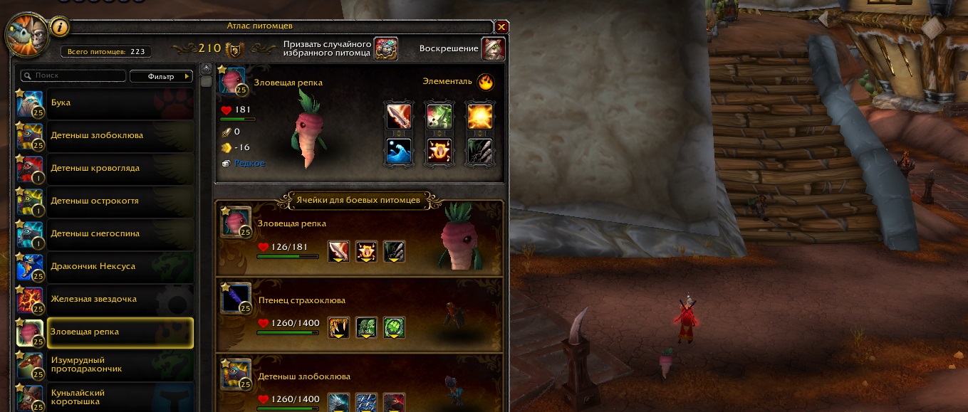 | Description | https://www.wowhead.com/ru/npc=63365/зловещая-репка 25 уровня имеет статы, не соответствующие её уровню. В атласе питомцев статы отображаются как 994/162/146, в бою статы вовсе 181/0/-16, после боя и в атласе питомцев статы отображаются как 181/0/-16. Согласно вовхеду статы должны быть 1481/289/273. Репка по сути незаменима в игре благодаря своему https://www.wowhead.com/ru/pet-ability=826/ослабляющий-удар , который позволяет ловить питомцев без риска случайно их убить. | ||||