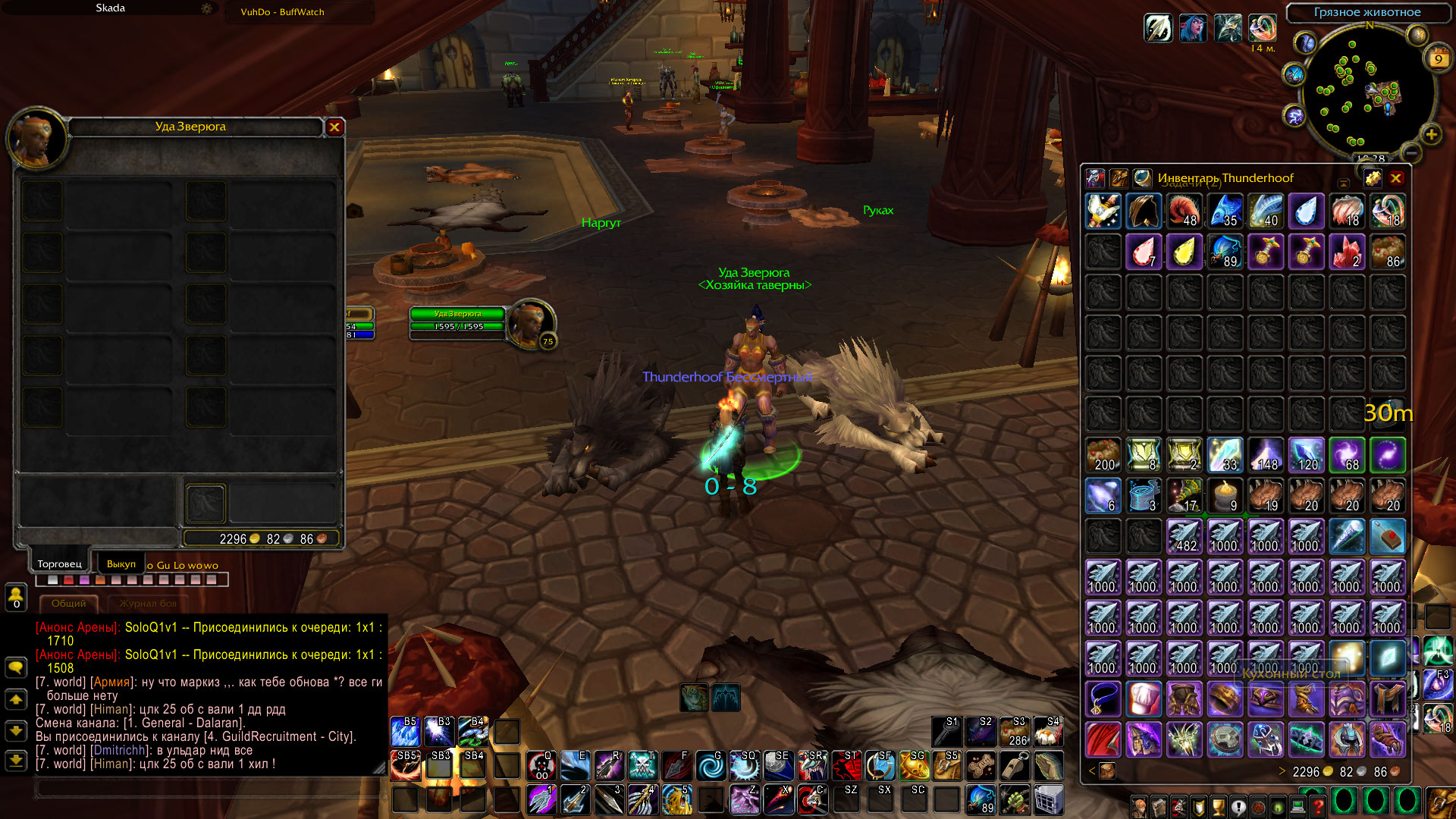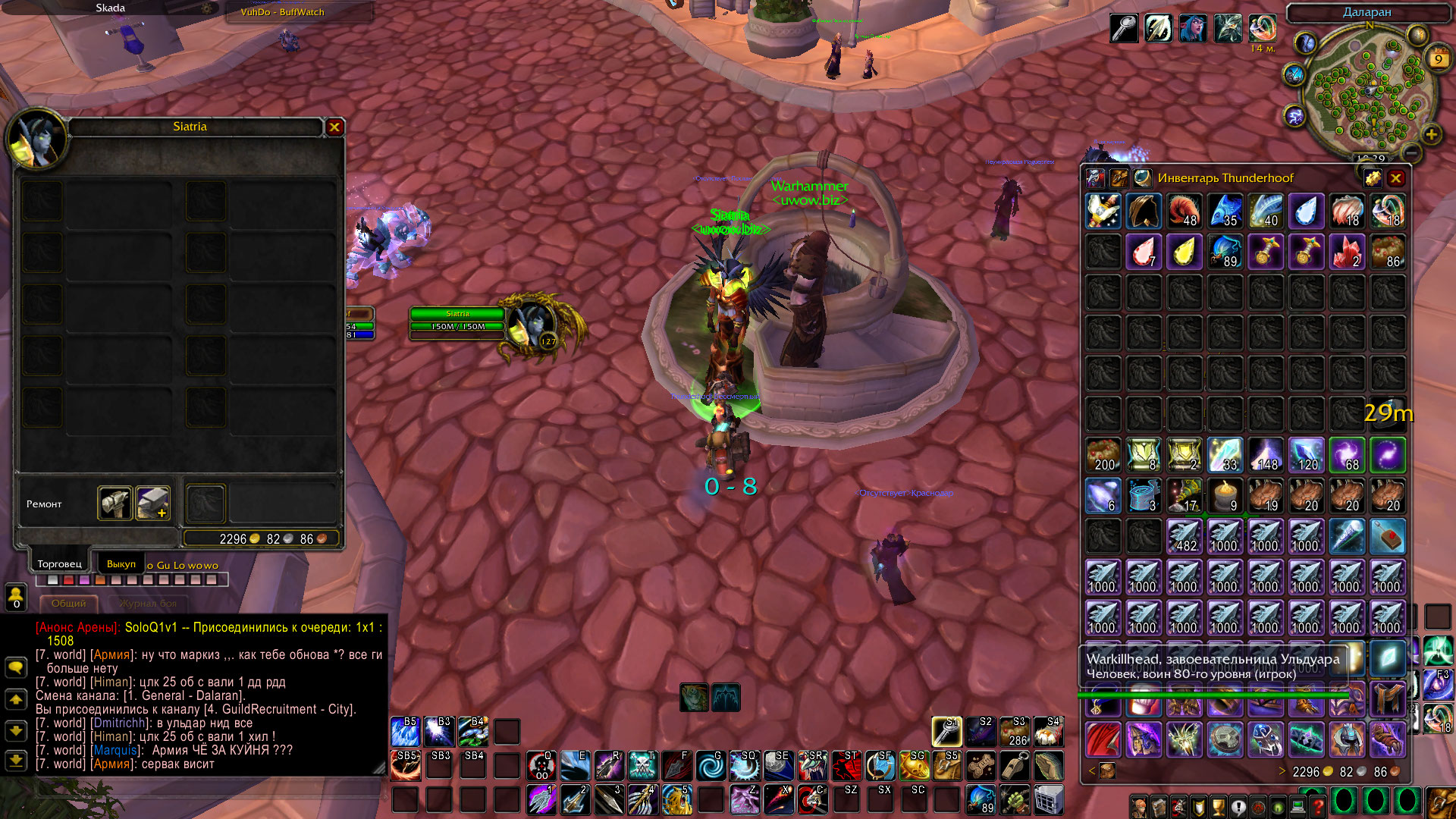 | Description | Доброго времени суток. После утренней перезагрузки сервера х30 (возможно на х1 тоже самое, проверить возможности нет), у всех игроков пропали гильдии, пропали вещи из любых вендоров/нпс, сломались скрипты некоторых заданий (дейлики серебряного турнира, пока проверил только их), и гости даларана не долетают до самого даларана, а падают в лес хрустальной песни, и там настакиваются. На скриншоте можно увидеть, что гостей настакалось более 100, фпс умирает ещё на площадке краса. | ||||