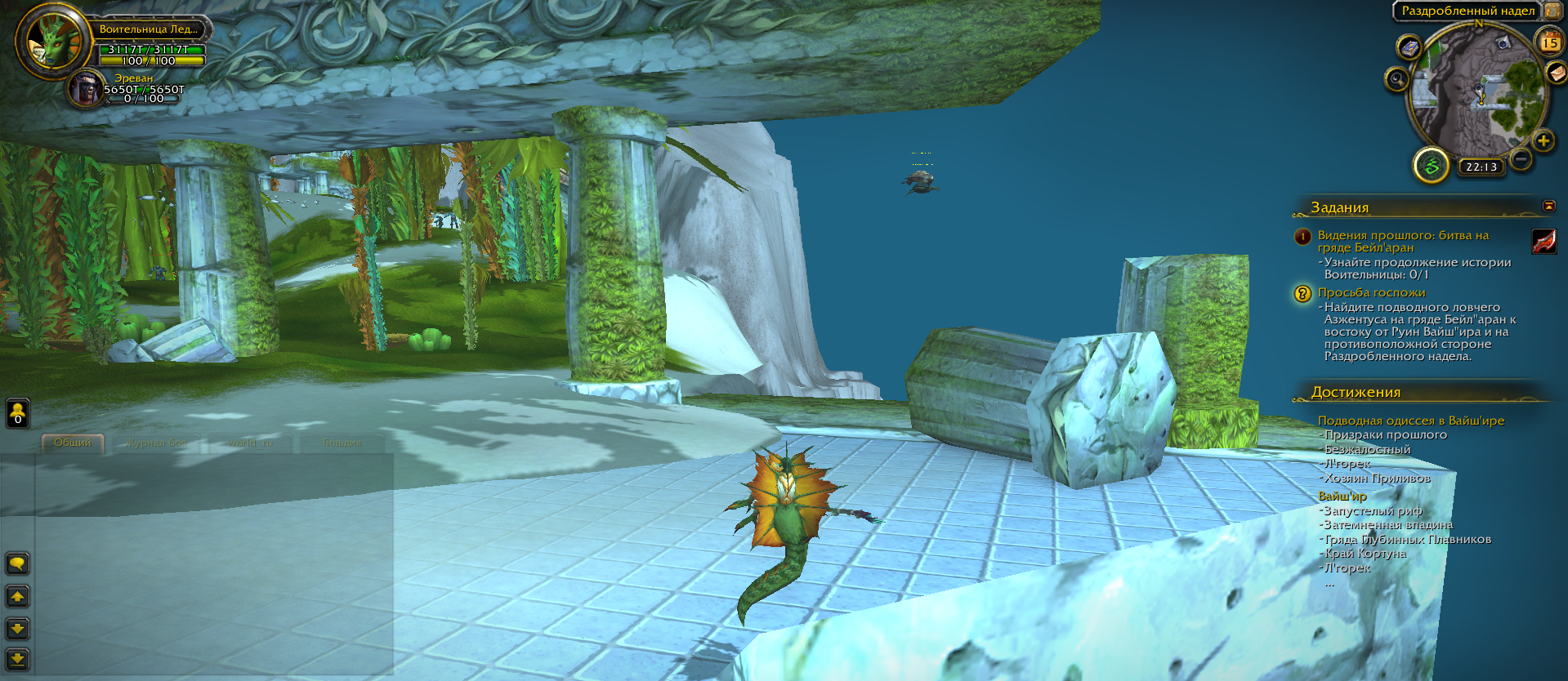 | Steps To Reproduce | Переключиться в образ наги около https://www.wowhead.com/ru/npc=42076/леди-назжар с помощью квестового предмета https://www.wowhead.com/ruitem=55171/клинок-воительницы-леди-назжар, взять квест https://www.wowhead.com/ru/quest=25858/просьба-госпожи и после его выполнения плыть к противоположному концу обрыва для сдачи квеста этому nps: https://www.wowhead.com/ru/npc=42074/подводный-ловчий-азжентус Пример выполнения: https://www.youtube.com/watch?v=yRbe7dnr8To | ||||