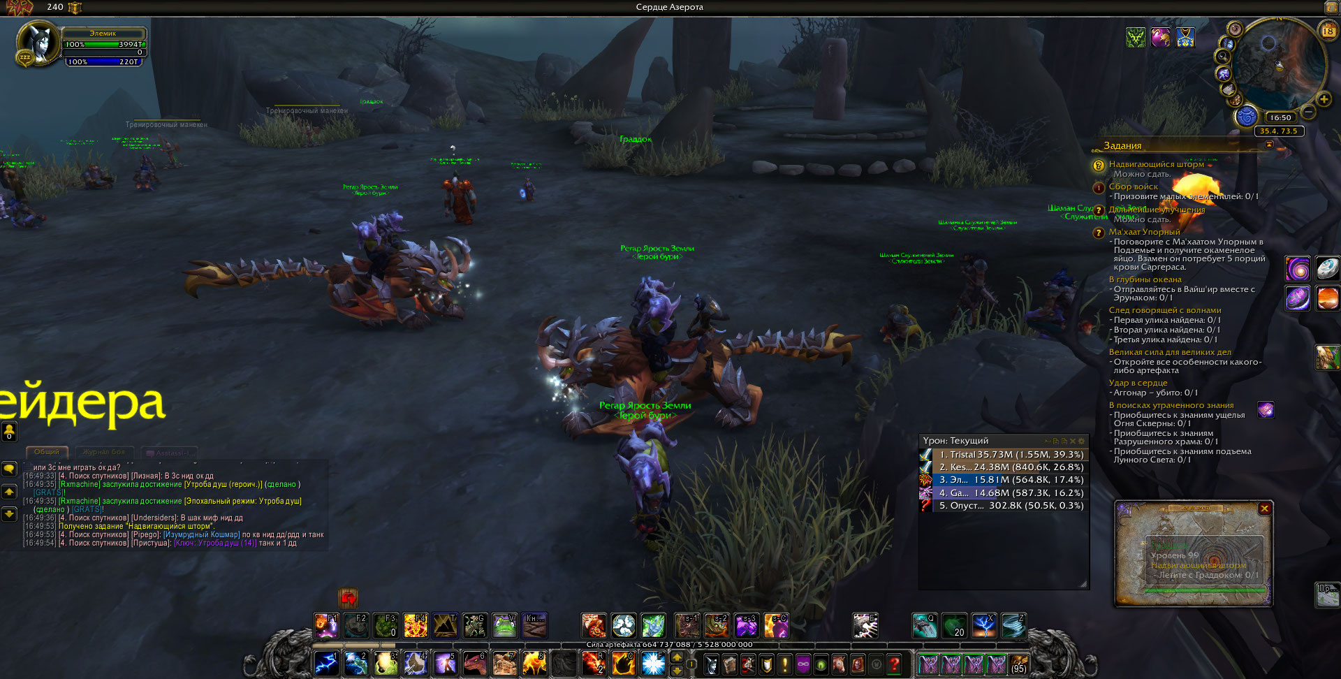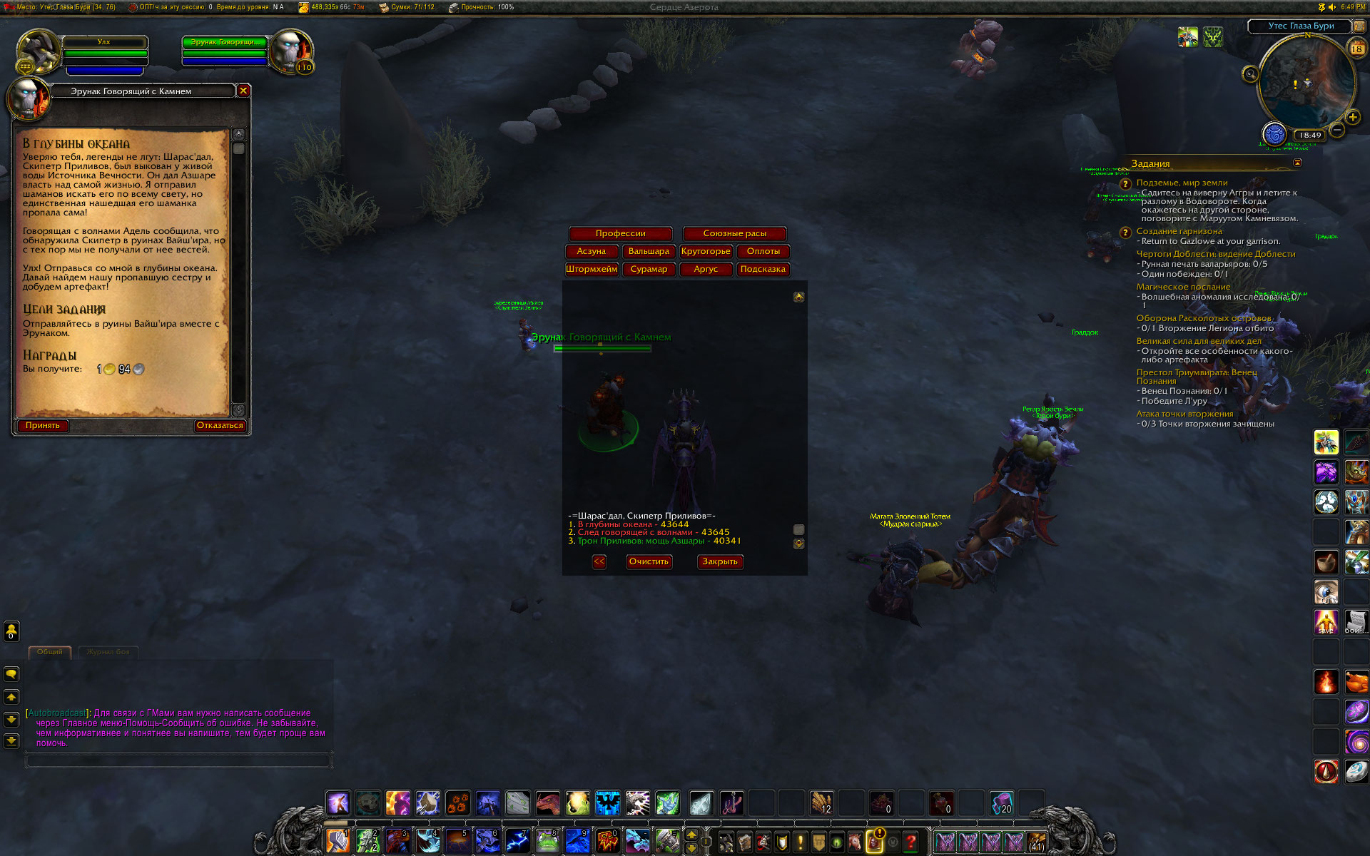 В общем, получил я Молот Рока, а цепочки на два остальных арта как то не задались. Ни в Вайшир ни в Пандарию перемещения не было, а на местах квесты того. В Пандарии можно было взять квест Кодекс Ра (это следующий после Надвигающийся шторм, который таки можно сдать на площадке перед Храмом), но в Залах Голай - голяк, никаких контейнеров и НПЦ по квесту не нашлось. И бегал так наверно месяца три, пока не вспомнил, что ктото из тестеров писал - для получения арта шаман может выполнить сразу крайний квест цепочки, пропустив нереализованные ныне квесты цепочек. Поднялся на площадку, на которой раздают квесты на артефакты и нашел у НПЦ нужные квесты. Немного сбило с толку , что маунтов на которых можно сесть несколько. Один из них отвез куда надо, сценарий запустился. Речь о Вайшире. А в Пандарии просто прилетел на место и принял к выполнению именно третий квест цепочки. На скринах видно, что в каждой из цепочек квестов есть разрывы, но финальные квесты выполнены и артефакты получены. Понятно что цепочки либо не реализованы в полном объеме либо сломаны, но вроде бы возможность получить артефакты есть. Проверяйте, ищите НПЦ с финальными квестами. |
