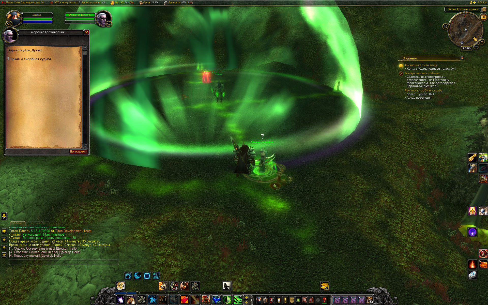 | Additional Information | на площадке постоянно присутствует НПЦ Череп Гулдана, который должен появляться только на время выполнения соответствующего квеста. По этой причине прошу заодно проверить работоспособность аналогичных по компоновке квестов этой цепочки https://ru.wowhead.com/quest=28256/%D1%87%D0%B5%D1%80%D0%B5%D0%BF-%D0%B3%D1%83%D0%BB%D0%B4%D0%B0%D0%BD%D0%B0 https://ru.wowhead.com/quest=28257/%D0%BF%D0%B0%D0%B4%D0%B5%D0%BD%D0%B8%D0%B5-%D1%82%D0%B8%D1%85%D0%BE%D0%BD%D0%B4%D1%80%D0%B8%D1%8F | ||||