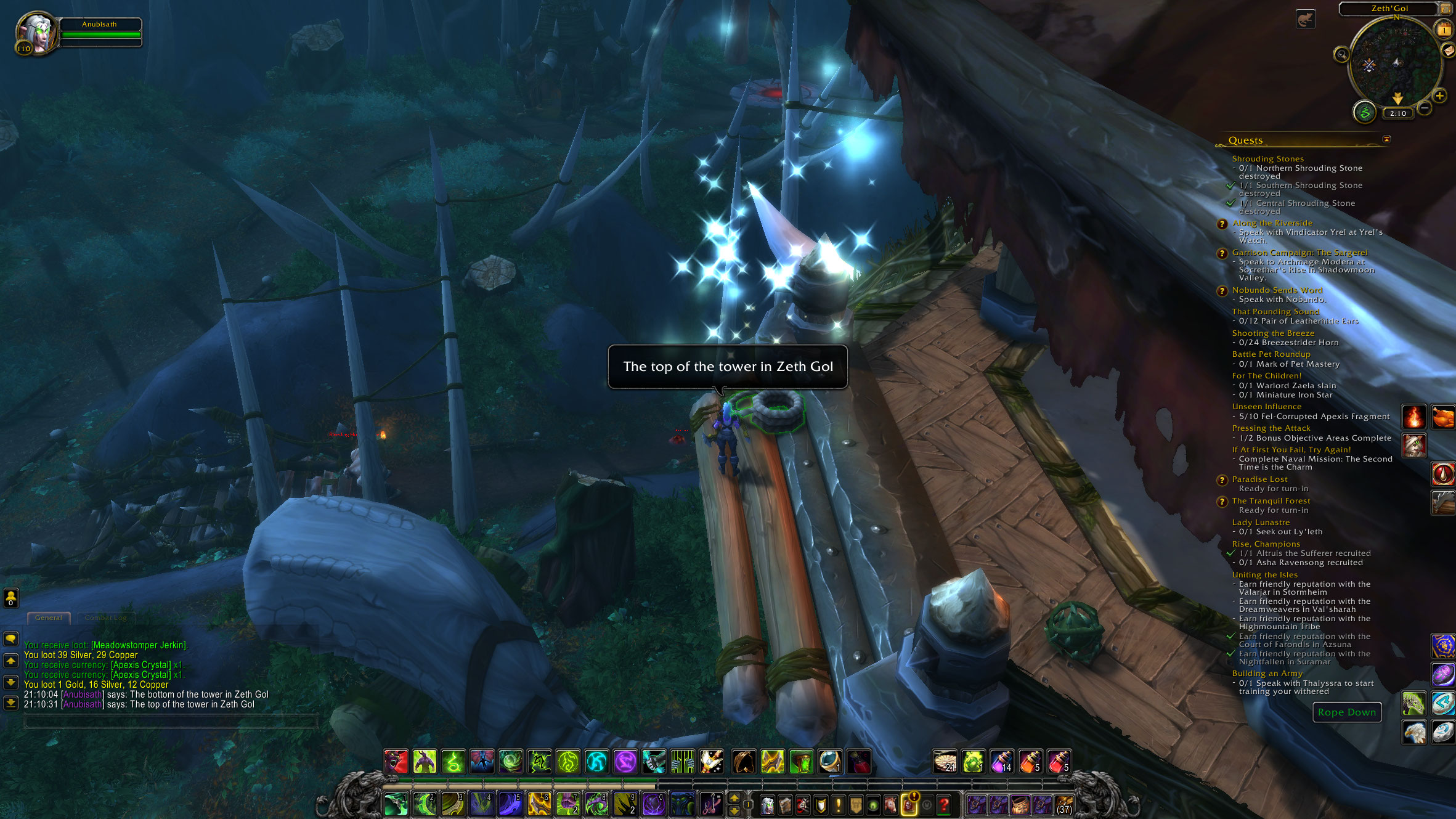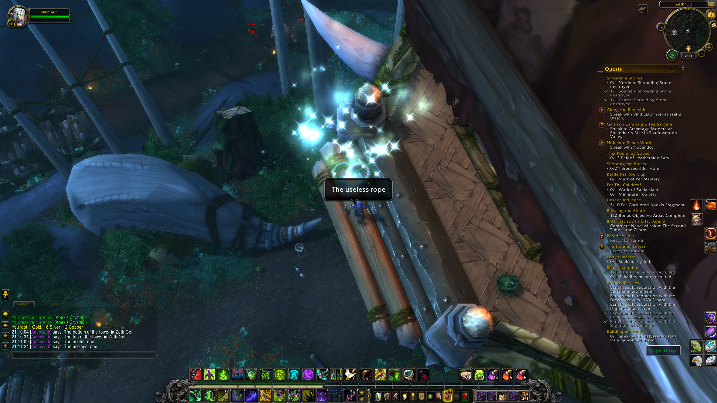 DescriptionQuest "The Bane of the Bleeding Hollow" (quest=38560): there's a rope on the ground at the base of a tower that (correctly) takes you to the top of the tower, but the rope at the tower top that should take you down down doesn't work.