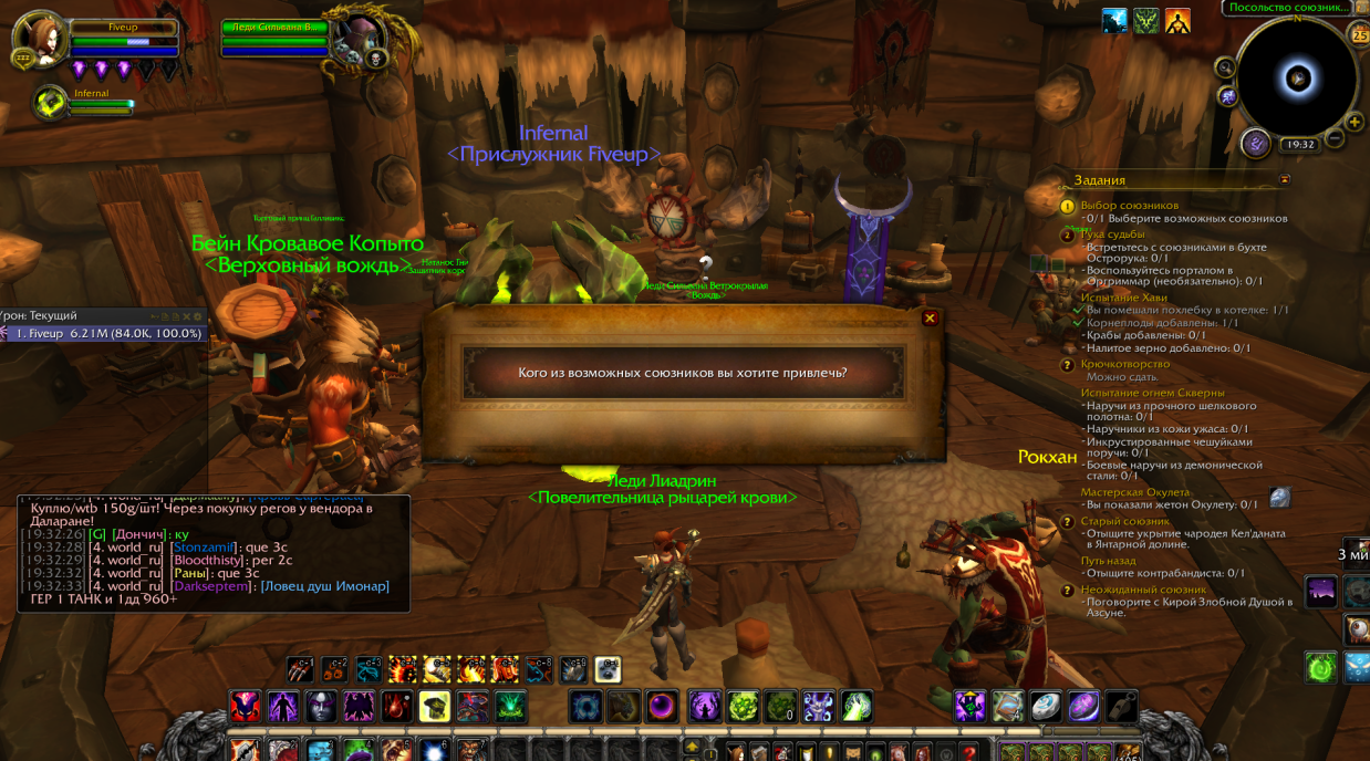| Description | Задание "Выбор союзников", Выберите возможных союзников. После диалогов с представителямит созных рас и Сильваной в окне выбора нет кнопок или другой возможности выбрать. Fiveup, Legion x100 | ||||