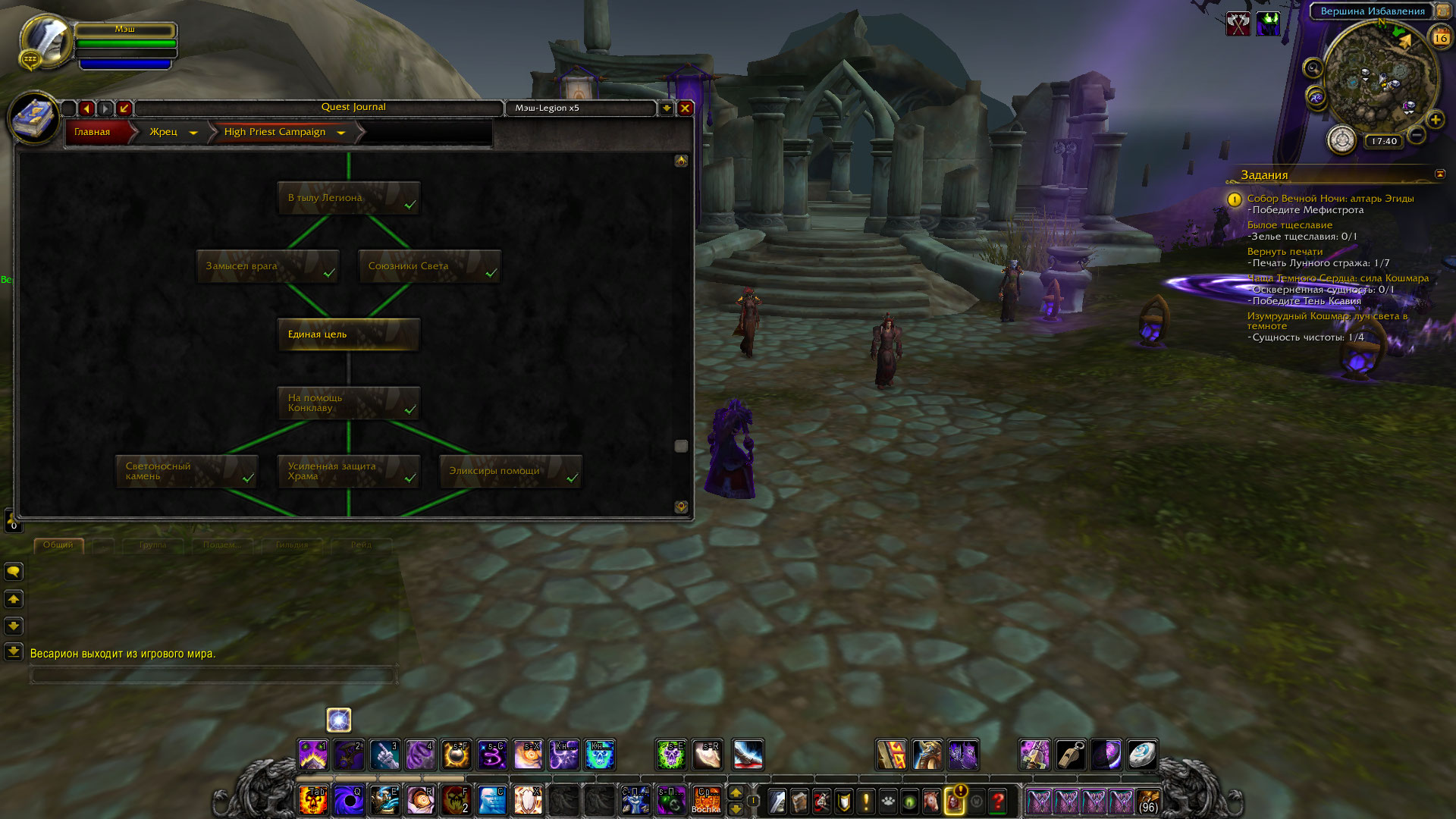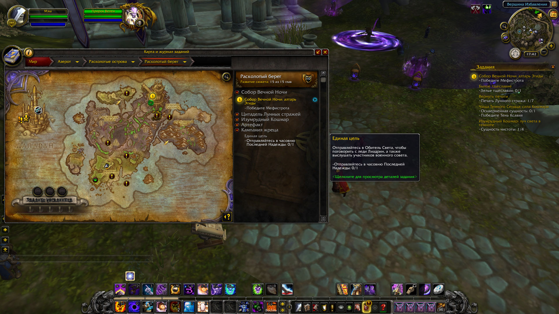 | Description | квест wowhead.com/ru/quest=43397/единая-цель не засчитался, однако следующий квест wowhead.com/ru/quest=43797/на-помощь-конклаву удалось взять и продолжить выполнение цепочки. Таким образом, с пропущеным квестом не получается закончить кампанию жреца и начать кампанию расколотого берега | ||||