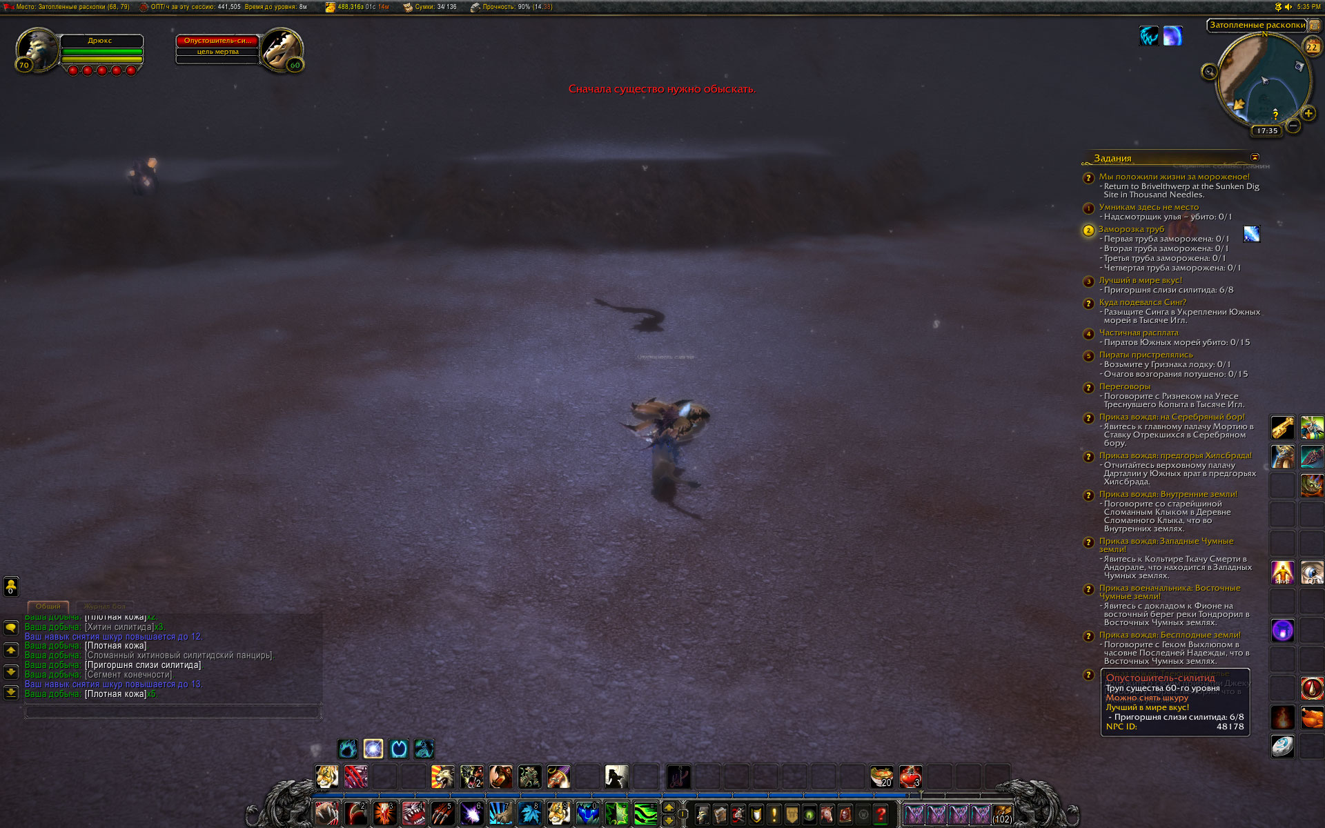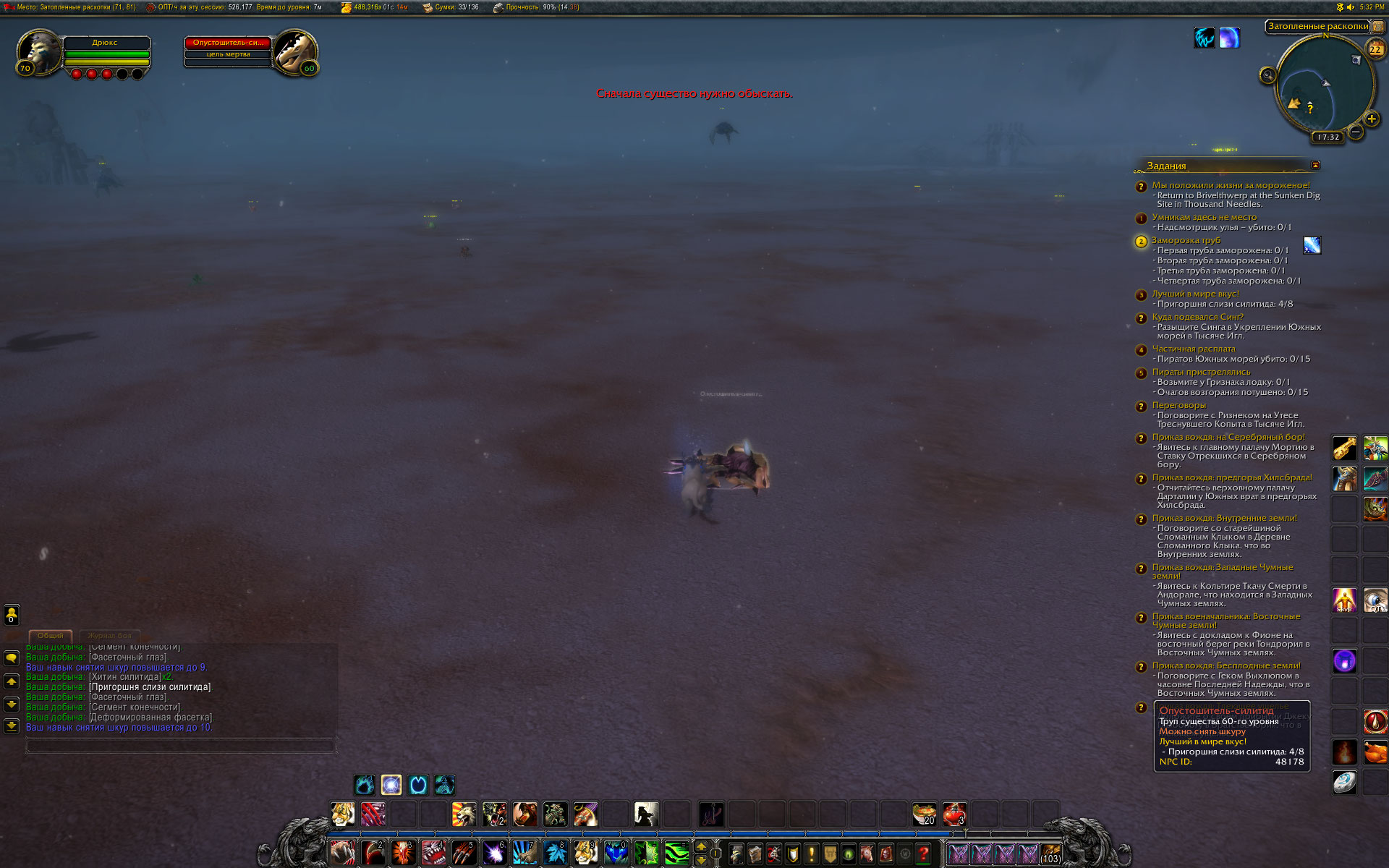 Друид, все мобы убивались Лунным огнем, после чего подплывал и собирал лут (автолут включен), снимал шкуры. Соединение с сервером - как обычно, в клиенте показывает 40-65мс задержки, фризов или неравномерности перемещения не замечено. Клиент 32 бит, комп старый, да. ТАк что возможен вариант, что глюки с фантомным лутом возникают именно в клиенте, при условии, что лут генерится на стороне клиента. На период проявления ошибки были активны еще два квеста из той же зоны - собрать утопленников и заморозить трубки в пещере. Еще сразу заметил, что как только собрал нужное количество квестовых предметов из силитидов - ошибки как на скринах сразу же прекратились. И еще такой момент - за время выполнения квеста попалось три моба, у которых в луте не было ни квестового предмета ни обычного лута, два из них выдали сбой на попытку снять шкуру, третий позволил себя раздеть.Сбоев не было, если в луте было хоть чтото добыто. Перепроверил только что - 50 мобов , ни одной ошибки. |