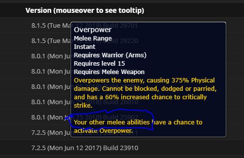 Если прок будет от автоатак, которые не контролируются нажатием, в отличии от способностей, и у рппм есть особенность - проки отрабатывают чаще в начале боя, им наплевать на то, какой источник является срабатыванием, автоатака ближнего боя или способность ближнего, но, так как вы навязываете будут происходить не от контролируемых атак, а затем проков будет меньше и в какой то фазе боя когда вот вот вам нужен прок овера, он не прокнет, потому что автоатака, что вызвала его прок ранее, является причиной того, что удачный прок от автоатаки подвинет таймер следующего прока ауры. В дбц с 7.3 описание клиента ясно и четко говорит, что "Другие ваши способности ближнего боя с некоторой вероятностью могут активировать "Превосходство"." Это означает, прок от абилити только возможен, автоатак здесь нет и близзы отказались от этого изменения после 7.2.5, ну или просто изменения не было, а описание не соответствовало действительности и поэтому ресурс вовхеда посчитал это как не зафиксированное изменение Кстати, за срабатывание отвечает вот эта аура https://ru.wowhead.com/spell=119938, вот смотрите, когда ее изменяли, потому что она активирует вам этот эффект, не сама способность, которую вы используете. Зачем мне советовать гуглпереводчик кстати? Для чего? Не кажется смешным? |
