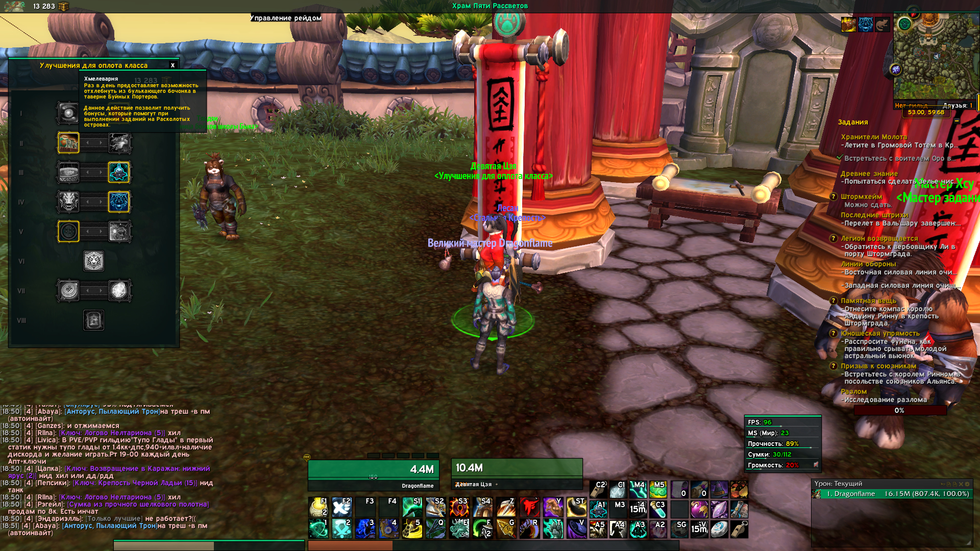| Description | Улучшение "Хмелеварня" позволяет один раз отхлебнуть из булькающего бочонка в таверне Буйных Портеров в оплоте класса, но вход в эту таверну попросту закрыт и открыть его никак нельзя. | ||||