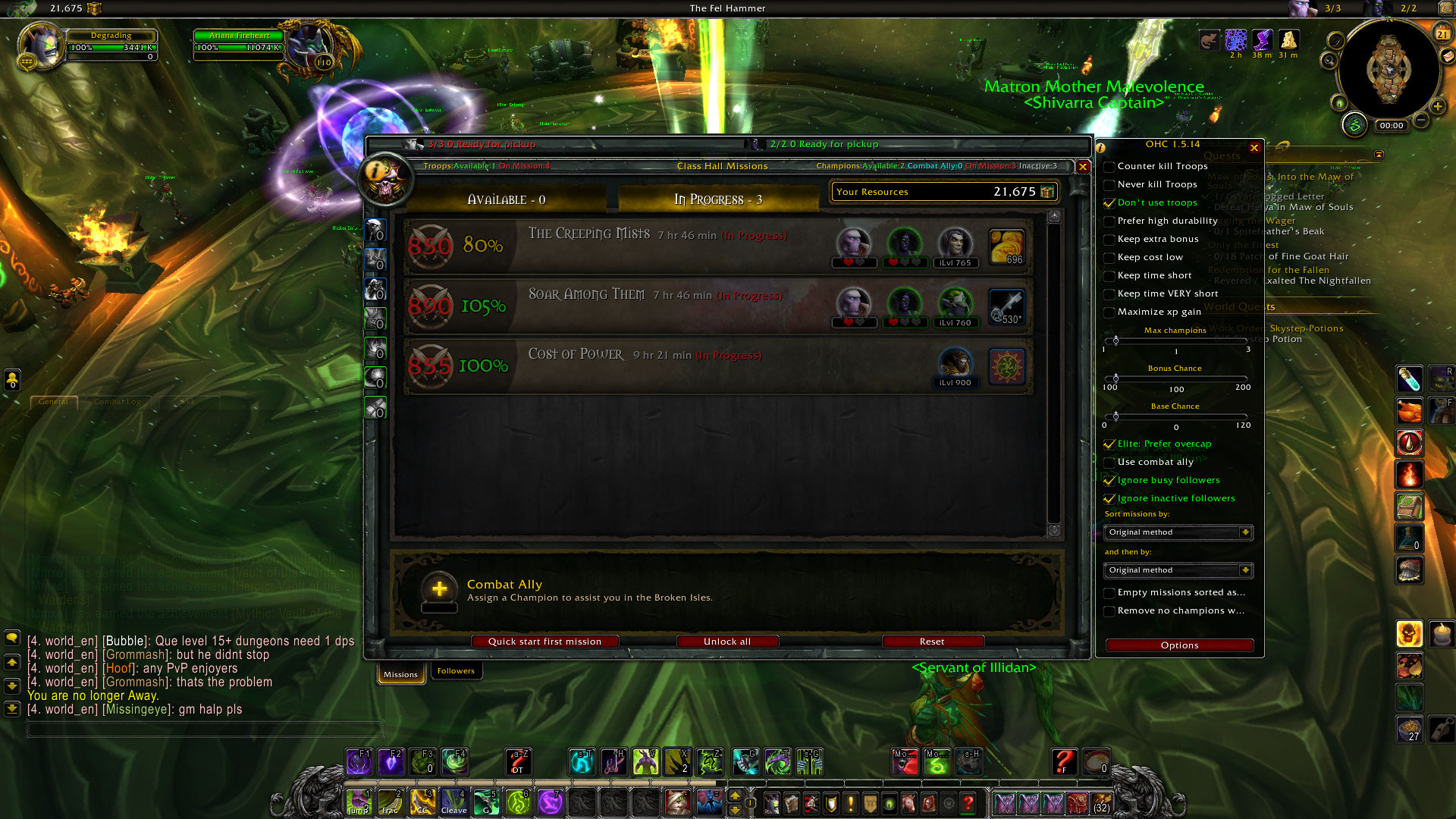 | Description | There are a couple problems with the class hall missions, I am not sure if it's for all classes as I only play a Demon Hunter, but as a Demon Hunter my missions are most if not all above 850 gear score, while my followers are mostly <800 gearscore. Only follower I have that is 900 is at 900 gear score because I used an item I got from a mission that instantly gave that follower 900 gear score. Anyway it makes the whole system pretty broken to a point where I can't send a mission unless I add minions, because the followers don't add a % to the success rate, only the minions do. Also there's another problem where the missions I send, let's say it shows 110% success rate, come back and show as 60% success rate, which sometimes makes me lose the mission I preemptively sent as a mission that will succeed, which it didn't. I guess what happens is the minions % doesn't count because of some miscalculation with the mission success rate, and only the follower % is added, I don't know. So ya I guess this isn't how it's supposed to work, and it definitely sucks to have it this way. | ||||