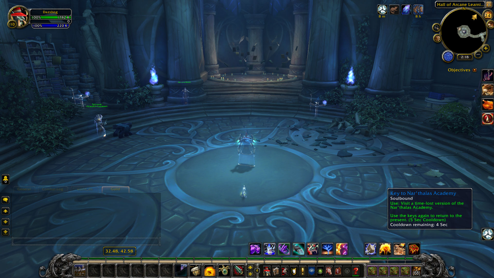 | Description | After investing many hours into the Archaeology profession, I finally got the item that I was looking for. The rare Key to Nar'thalas Academy can be used in the Hall of Arcane Learning in Nar'thalas Academy to visit a time-lost version of the Academy. Accessing this alternate timeline allows you to play different games and access different challenges. Most notable of these challenges is the ability to challenge the Headmistress of the Academy to a fight. If you win, you get the Headmaster (or Headmistress, if female) title. This is the only way to get this title and specifically why I started Archaeology. The lack of this phased content completely prohibits players from engaging with the hidden games, challenges, and boss fight that rewards the title for their hard work. |