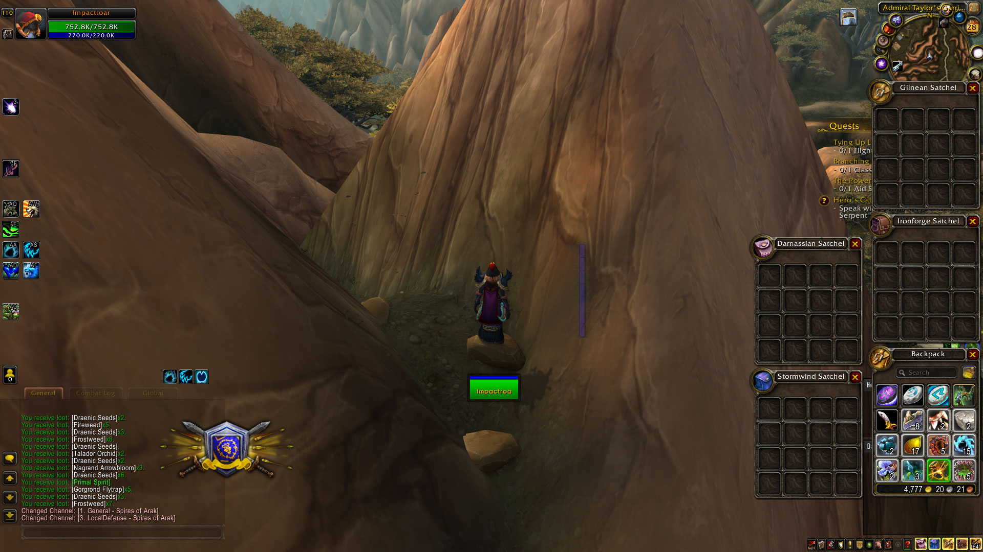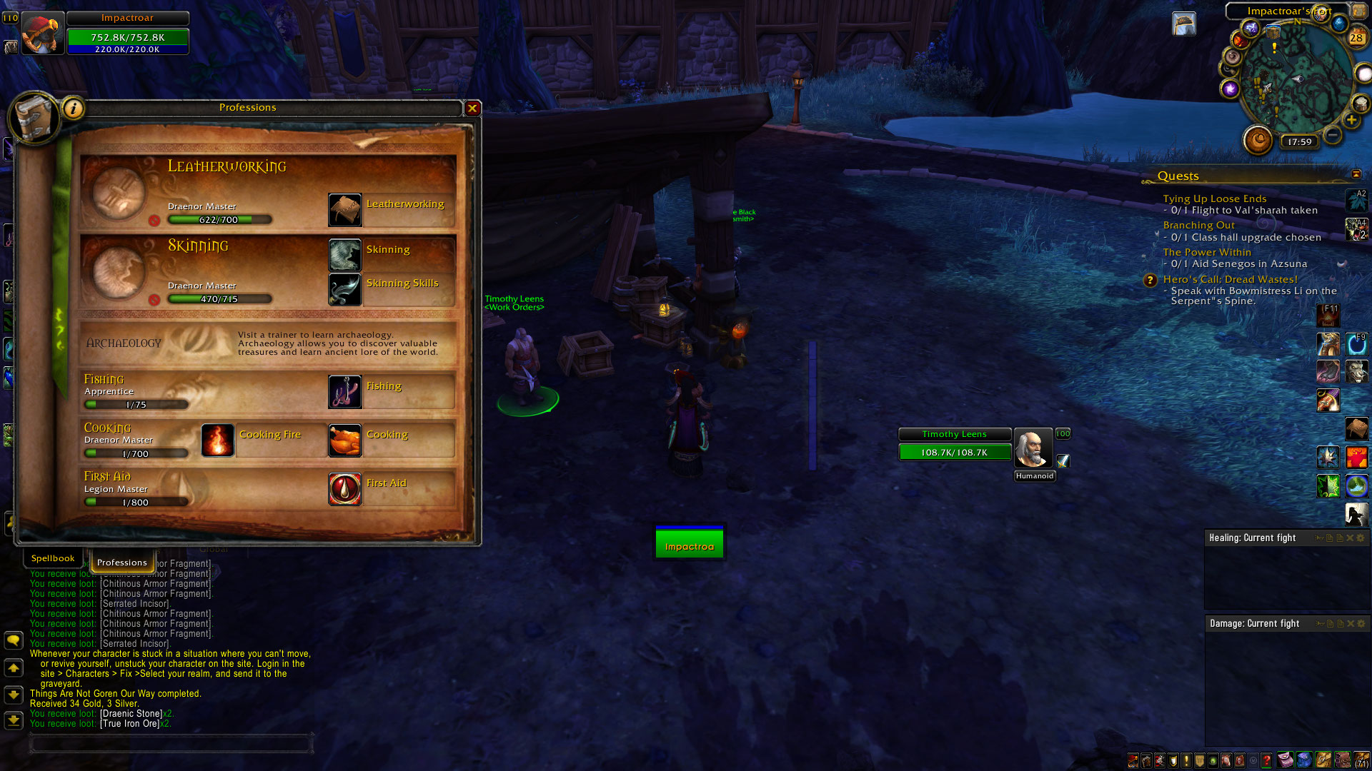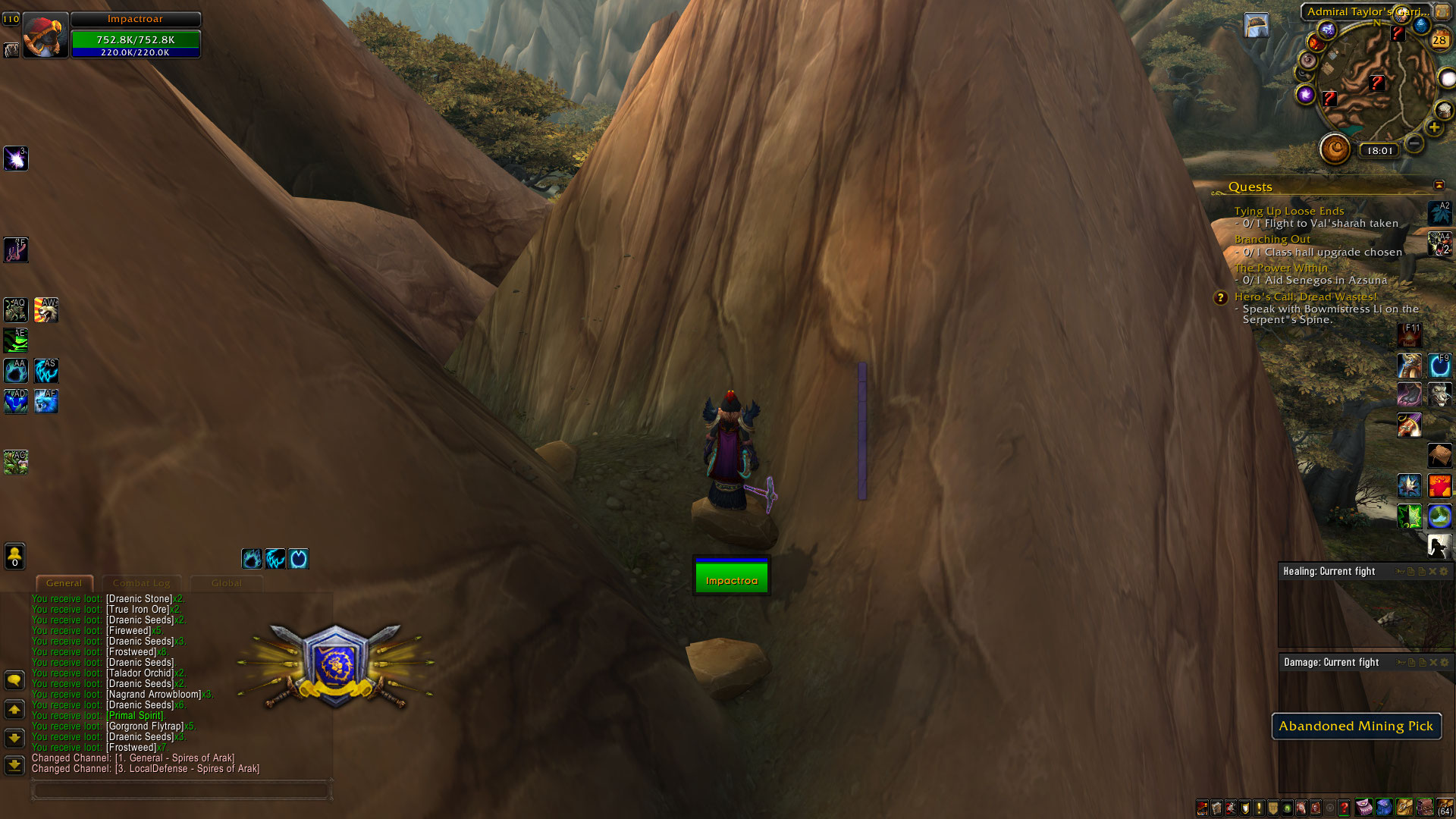 | Description | https://www.wowhead.com/item=116913/peons-mining-pick?bonus=6691 Char name : Impactkeg > orc female > horde > garrison mine level 2 I was able to aquire this item from : https://www.wowhead.com/object=235313/abandoned-mining-pick Item does not decrease mining time in the garrison mine. I had the item in my inventory. I even equiped the item. Char name: Impactwords > night elf female > alliance > garrison mine level 1 Impactroar > worgen female > alliance > garrison mine level 1 Both characters have the same problem. I was NOT able to aquire this item from : https://www.wowhead.com/object=235313/abandoned-mining-pick When i try to interract with it it does the casting bar for 0.2 seconds and then the item dissapears from the map. It is not present in my inventory as shown in the screenshot. I checked the next day and the item was still missing from the map, from my inventory and was not in the mailbox. Also, after getting the Peon's mining pick, the Npc: Timothy Leens ( https://www.wowhead.com/npc=77730/timothy-leens#comments) should sell this item. He does not. | ||||