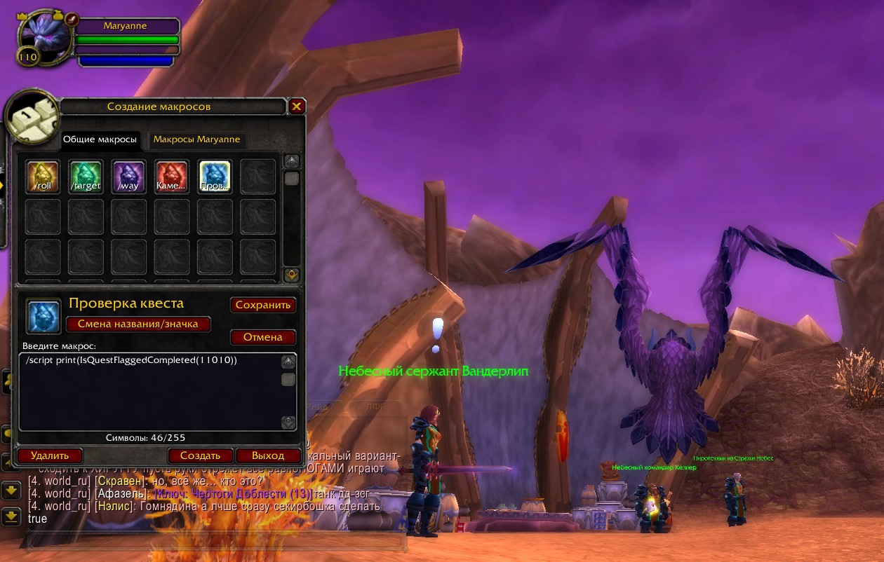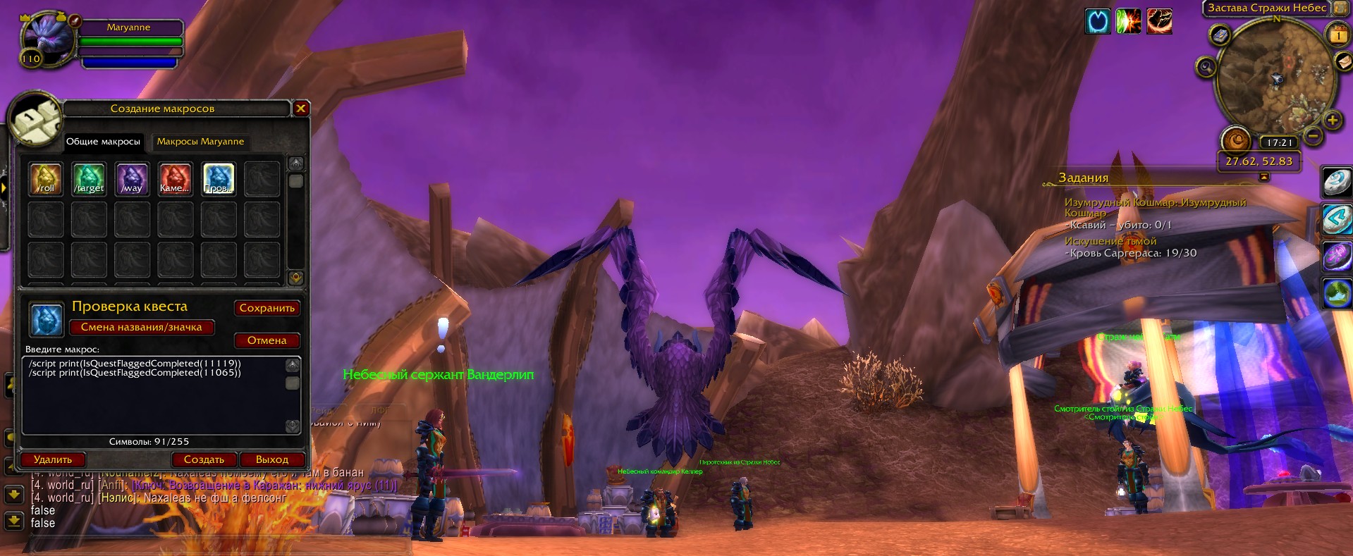 Через макрос /script print(IsQuestFlaggedCompleted(11010)) мне показывает иное. Хорошо. Тогда подскажите, пожалуйста, как мне его сделать, если теперь мне доступен только квест «Еще разок задать им жару!» (ID: 11023)? |
