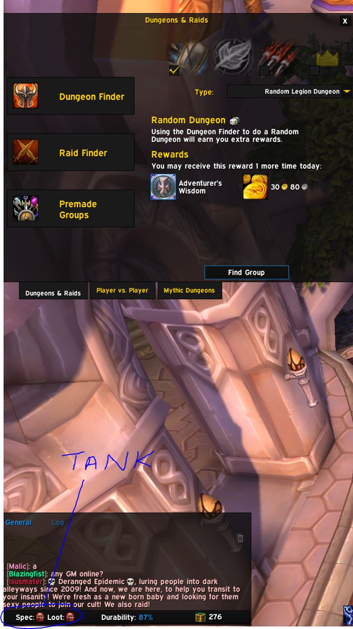 | Steps To Reproduce | Class: Blood DK (this is my only toon so can't vouch for other classes) Select Group Finder: Dungeon Finder---> Random Legion Dungeon---> Select role = Tank, Press 'Find Group' | ||||