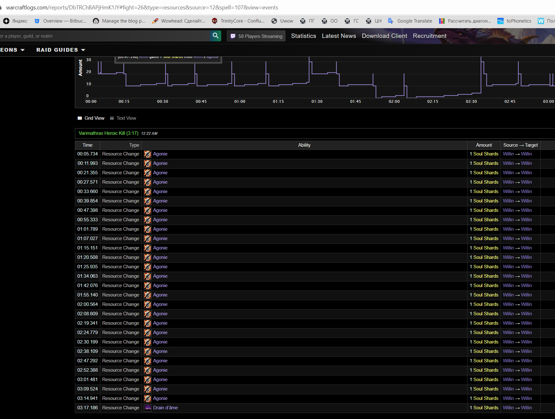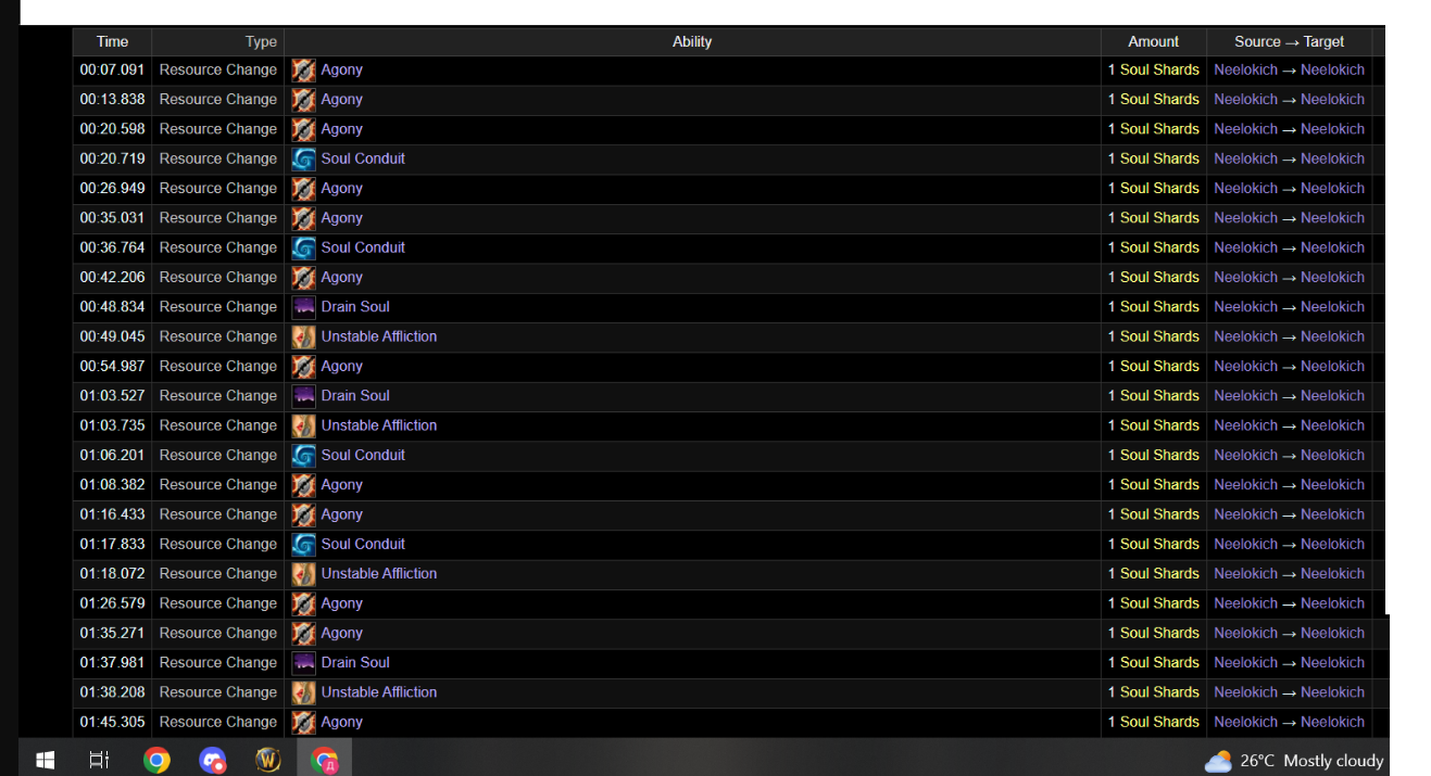 | Description | заклинание чернокнижника специализации Колдовство https://www.wowhead.com/ru/spell=980/%D0%B0%D0%B3%D0%BE%D0%BD%D0%B8%D1%8F в комментариях описание мне не совсем понятно, но не в этом суть поиграв на сервере я заметил очень неприятную особенность, а именно дико низкий интервал прока осколка, порой по 12-14 секунд найдя человека попросил дать лог боя рандомного 975-80 лока с обычными статами (30 30 120) и вот что в этом логе видно что - осколков больше на 10-8 попросив людей мне сделали ва которая линкует в чат интервал прока осколка от агонии, и он виден на скрине пожже возможно еще раздобуду скринов с логов | ||||