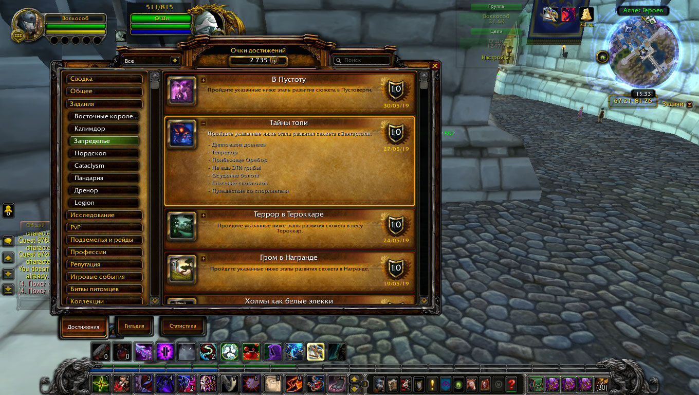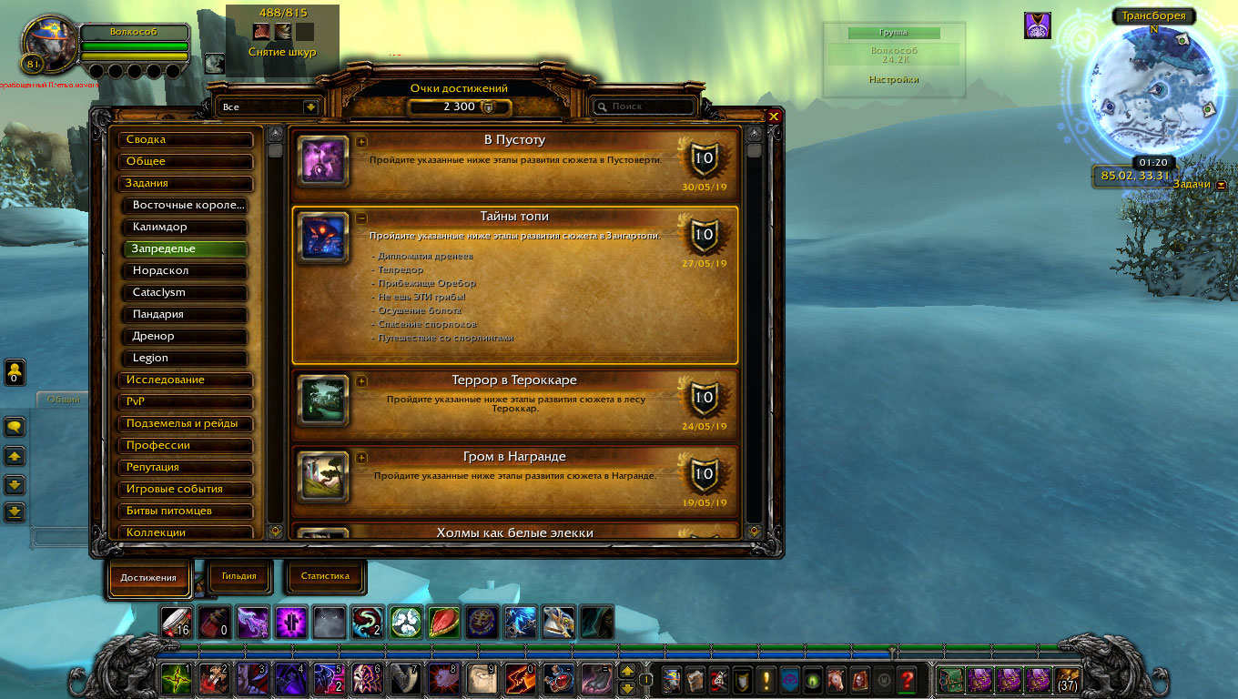 | Description | сбросилось достижение "Тайны топи"(https://ru.wowhead.com/achievement=1190/тайны-топи) у персонажа Волкособ после технических работ на сервере 28 или 29 числа. Само достижение в списке присутствует, но все пункты серые. При нахождении в локации "Загрантопь" при открытии карты указано "Развитие сюжета 0 из 7 глав". Доступных квестов соотвественно нет, кроме повторяемых. Достижение "Царь Споррегара"(https://ru.wowhead.com/achievement=900/царь-спореггара), полученное в тот же день осталось на месте. | ||||