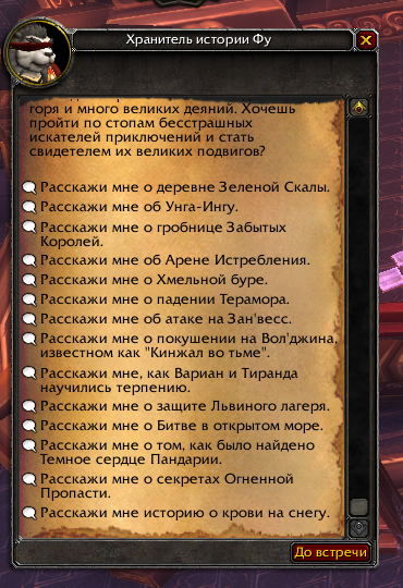 | Description | В пандарии у НПЦ Хранитель истории Фу в списке нет сценария "Фестиваль Хмельнолуния", хотя он должен там быть. | ||||