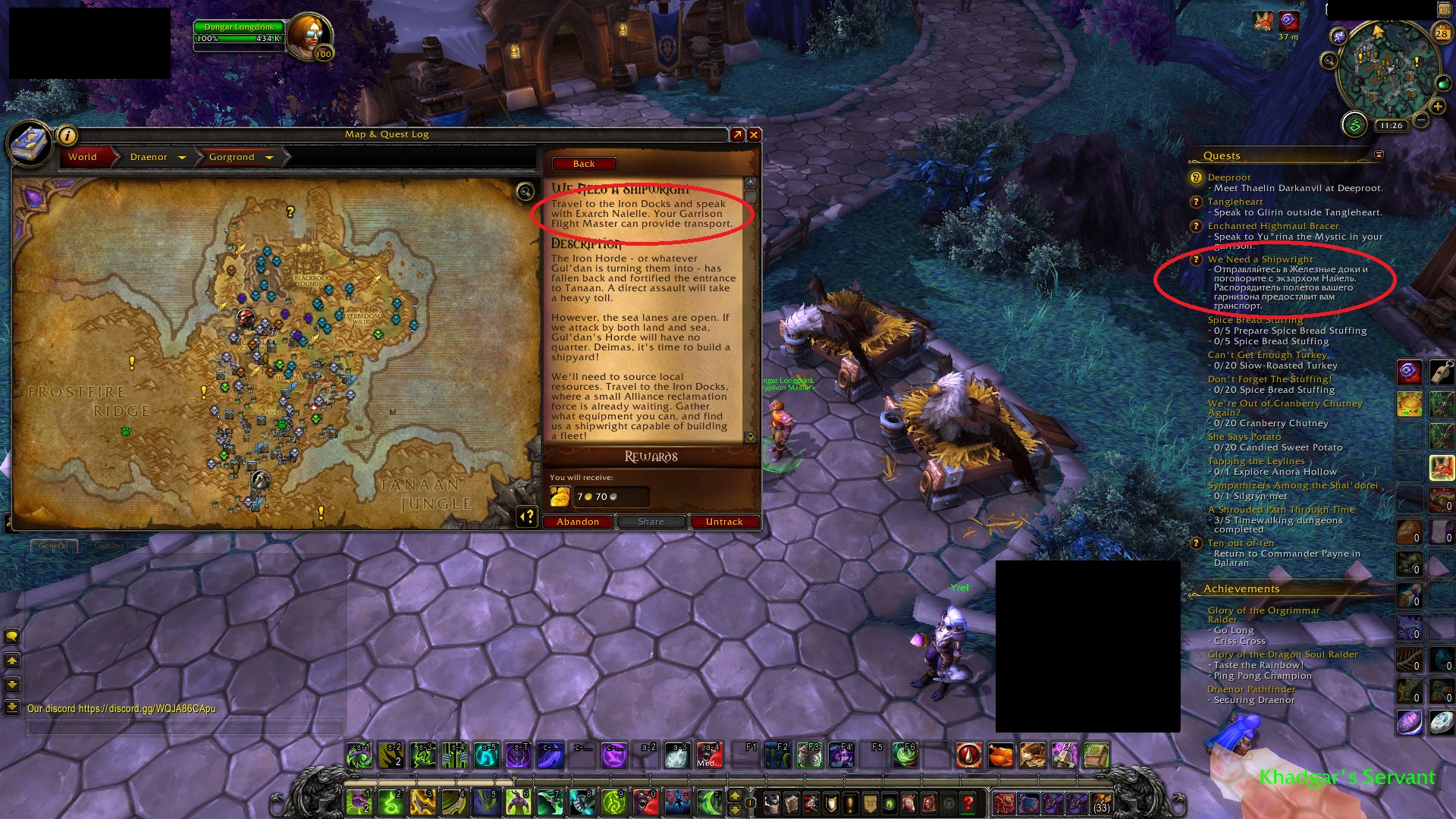 | Description | Alliance quest 'We need a shiperight' https://www.wowhead.com/quest=38257/we-need-a-shipwright The quest reads as: "Your Garrison Flight Master can provide transport", however offers no such option and simply brings up the normal Draenor map with various FPs. The near two are "Iron Docks, Gorgron" which isn't suitable as the nearest access point there is the normal dungeon portal that prevents access to the open world area needed for the quest, while the second is "Everbloom Overlook, Gorgrond" which is behind several mountains and bodies of water preventing land travel. | ||||