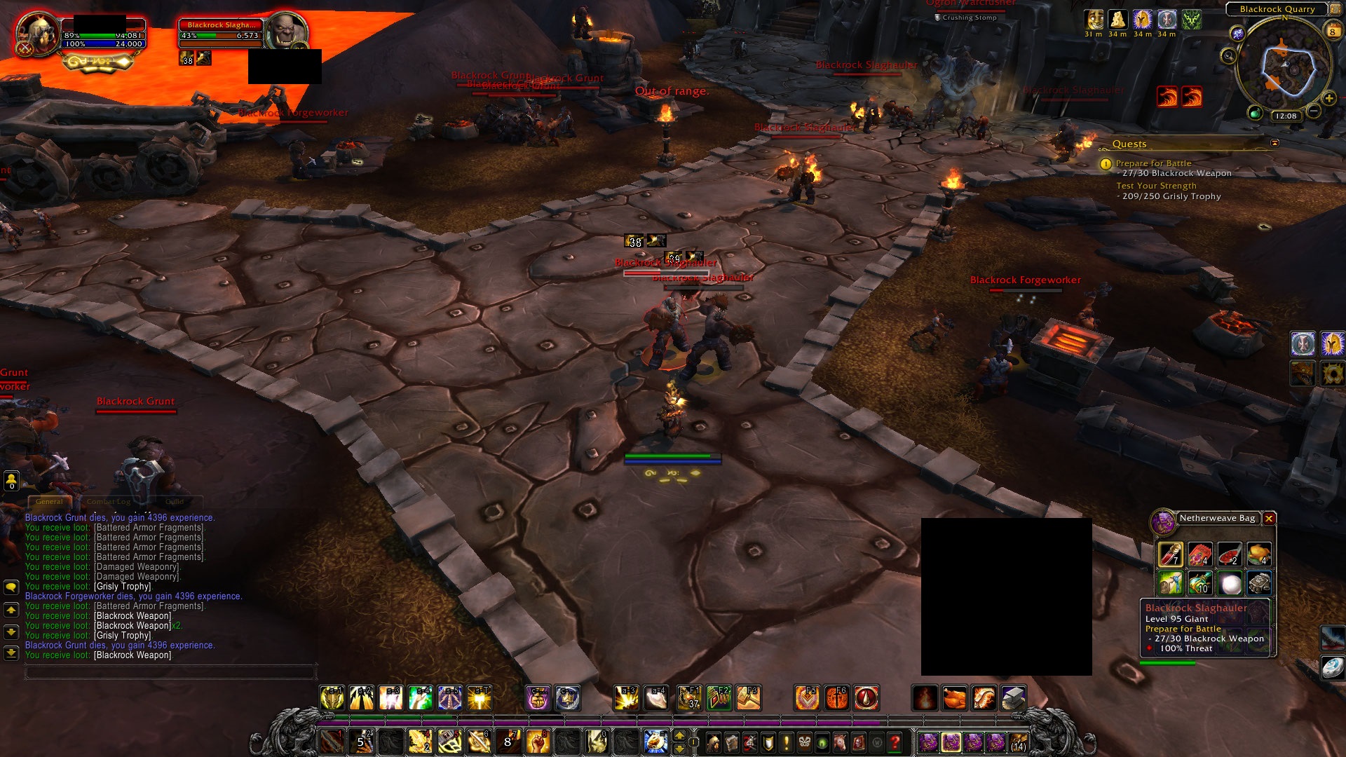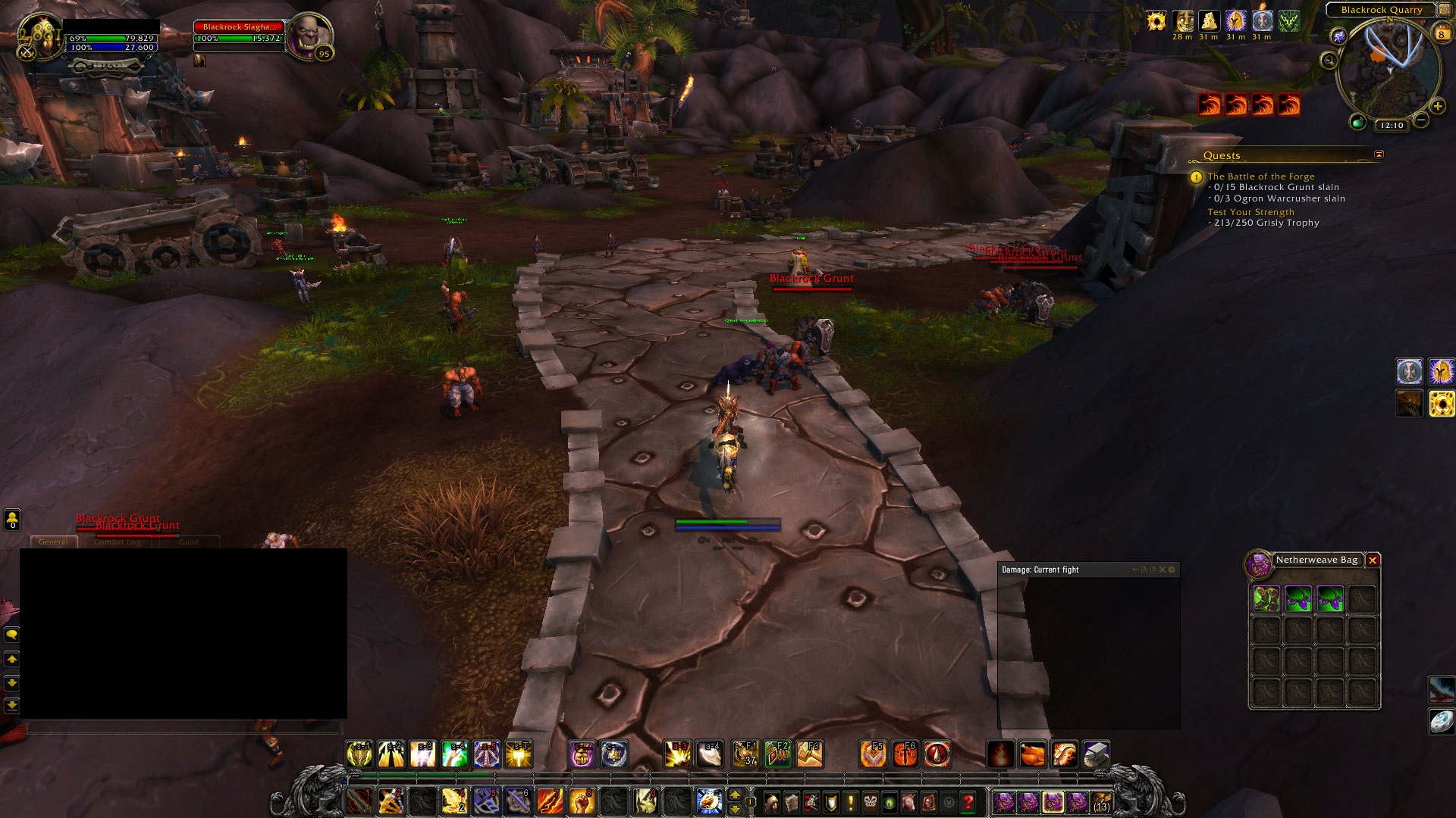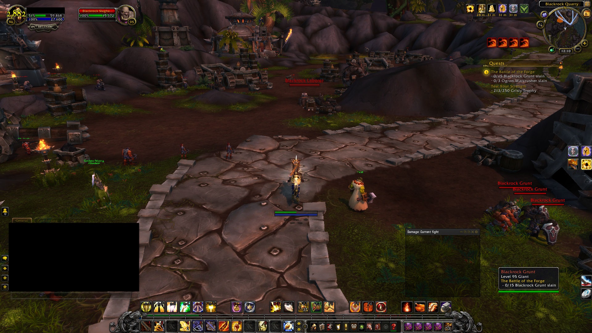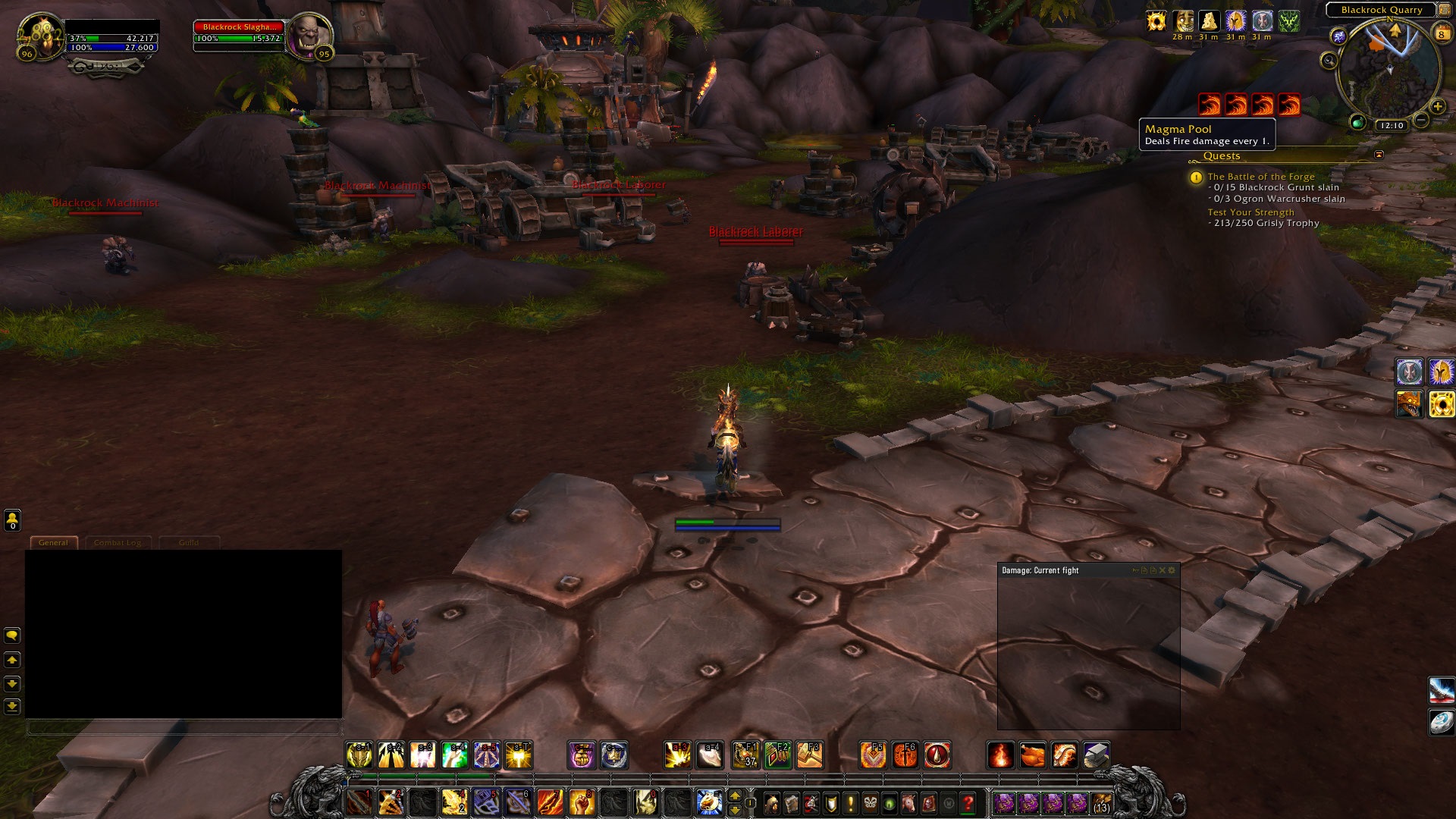 It's being caused by the Blackrock Slaghauler mobs in the area. If one of them gets close a single stack of the aforementioned debuff, Magma Pool, will appear, however there appears to be no upper limit on the stacks other than how many mobs are present. Attached pics: Fighting 1 mob, 1 stack Fighting 2 mobs, 2 stacks NPC fighting 1 mob, also gains a stack Last 3 attached images are taken over 3 seconds and I have 4 stacks because the mission I was on bugged and didn't spawn any of the bodyguard NPCs there are meant to be, so I figured I would try to find them in case they were stuck in combat. They weren't, they simply didn't spawn at all and only their post mission versions were present after the mission area so "rescuing" them did nothing. 1/3: 4 stacks from 4 mobs, 69% hp 2/3: 4 stacks from 4 mobs, 51% hp 2 seconds later 3/3: 4 stacks from 4 mobs, 37% hp 1 second later This effect is lethal and there's next to nothing that can be done about it except nuking mobs ASAP from as far away as possible so the aura doesn't kick in. Melee are horrifically disadvantaged by this, especially ones without significant defensive cooldowns and self heals. I was only able to survive by popping 2 of my big 3 defensives which at least still let me move as a Paladin. While something like Ice Block might mitigate the damage for a mage, it will only do so until the Ice Block runs out, and since Mages can't move under that effect the mobs will still be nearby and therefore simply apply the effect[s] again, killing the player. Additional note: NPCs not spawning correctly during 'The Battle of the Forge' https://www.wowhead.com/quest=34439/the-battle-of-the-forge |