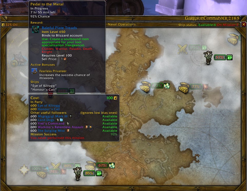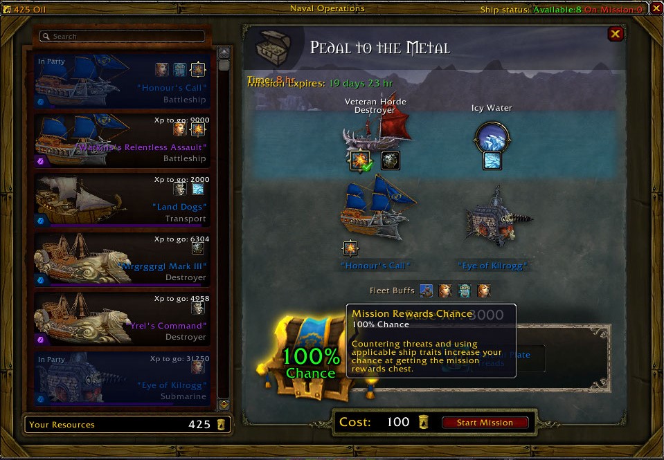 | Description | WOD garrison naval missions were purposefully designed with expendable ships in mind and for players to have to risk non 100% success rates, however missions 90% and above were meant to still save and ships present on the missions. Just had a 98% chance mission fail and destroy a ship, something that isn't meant to happen in the first place. | ||||