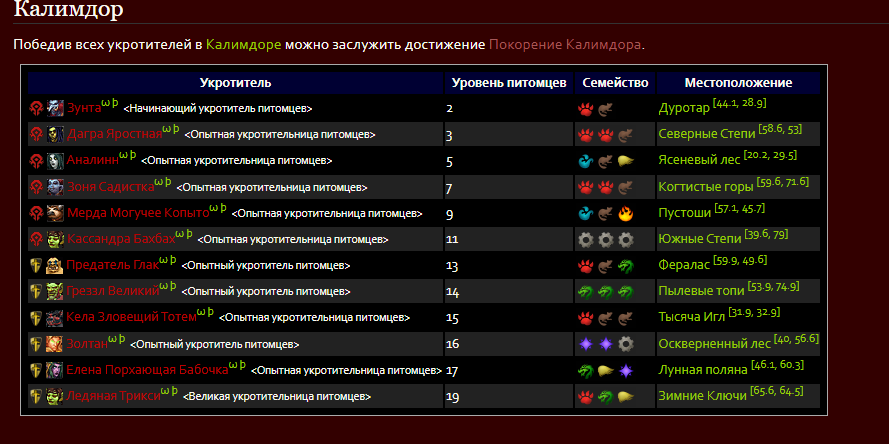 Здравствуйте! Проверил, подтверждаю. Не засчитывается в достижение https://www.wowhead.com/ru/achievement=6602 такие укротители как https://www.wowhead.com/ru/npc=66422 https://www.wowhead.com/ru/npc=66135 https://www.wowhead.com/ru/npc=66137 https://www.wowhead.com/ru/npc=66372 https://www.wowhead.com/ru/npc=66136 |
