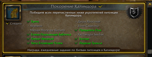 Я хочу сказать. То что я каждый день прохожу одно и тоже задание и не засчитывается в прогресс. Я вчера проходил начало битвы питомцев и 2 укротитель ДАРА ЯРОСТНАЯ не засчиталась хотя я убивал ее уже более 3 раз одним и тем же персонажем |