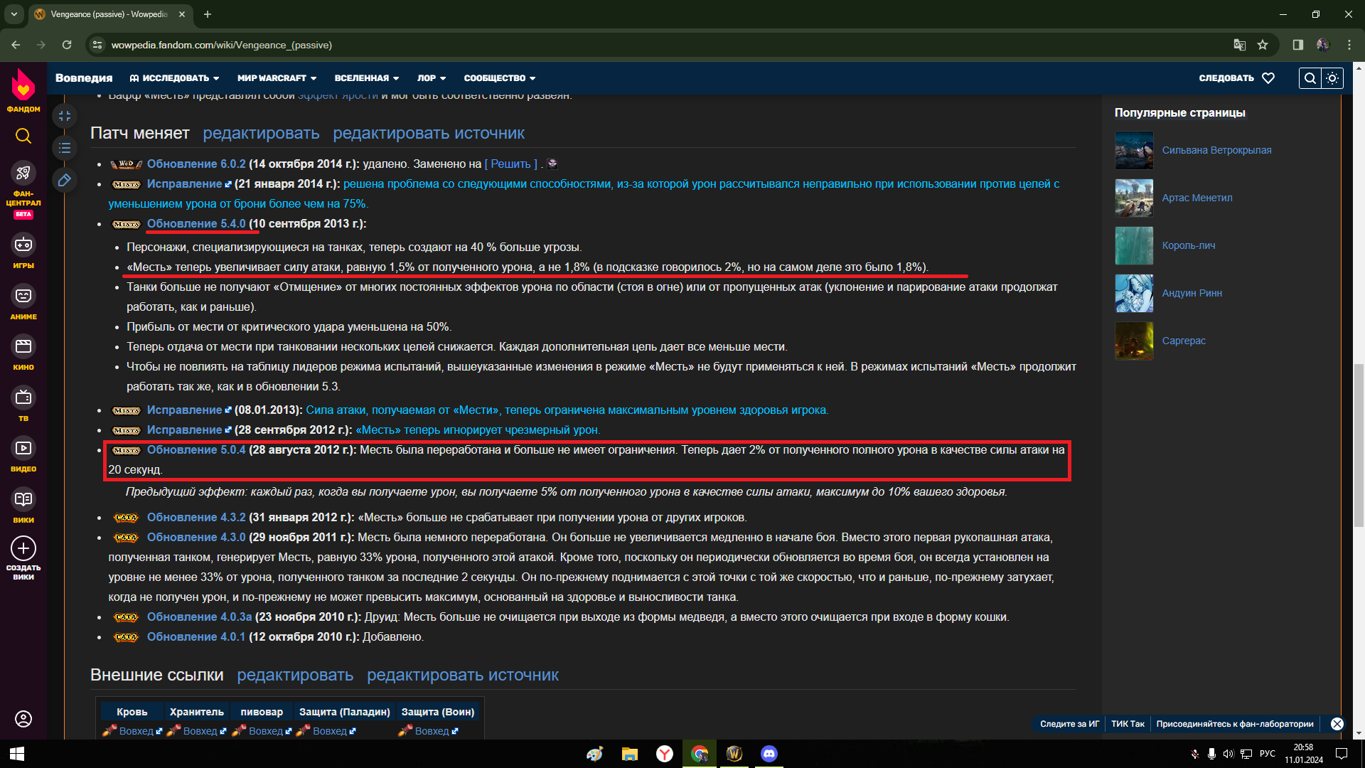 | Description | 1)https://mop-shoot.tauri.hu/?spell=132365 https://mop-shoot.tauri.hu/?spell=93098 Прот Воин https://mop-shoot.tauri.hu/?spell=84840 мишка Друид https://mop-shoot.tauri.hu/?spell=120267 Хмель Монах https://mop-shoot.tauri.hu/?spell=93099 ДК кровь https://mop-shoot.tauri.hu/?spell=84839 Прот Пал https://wowpedia.fandom.com/wiki/Vengeance_(passive) На данный момент спеллы имеют значение 1.5% т.к реалии клиента сервера на 5.4.8 , до 5.4 спелл имел значения 1.8% , имеет смысл на первые этапы сервера до Осады вернуть значение до 1.8% . | ||||