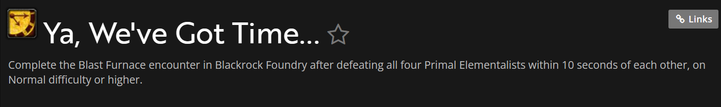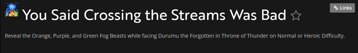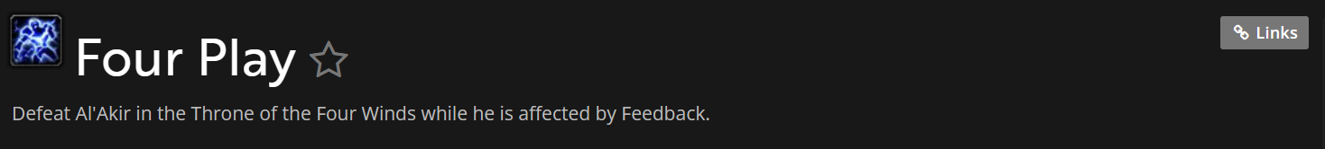 | Description | 1.achievement:“Four Play “@https://www.wowhead.com/achievement=5305/four-play ——————Al’akir P2 kill Stormling did not buff “Feedback” ,Resulting in inability to complete achievement 2.achievement:“You Said Crossing the Streams Was Bad“@https://www.wowhead.com/achievement=8098/you-said-crossing-the-streams-was-bad-———————There are no quest monsters 3.achievement:“Ya, We've Got Time...”@https://www.wowhead.com/achievement=8930/ya-weve-got-time——————try any way kill all four Primal Elementalists within 10 seconds of each other,It simply can't be done! Please help me, thank you very much! | ||||