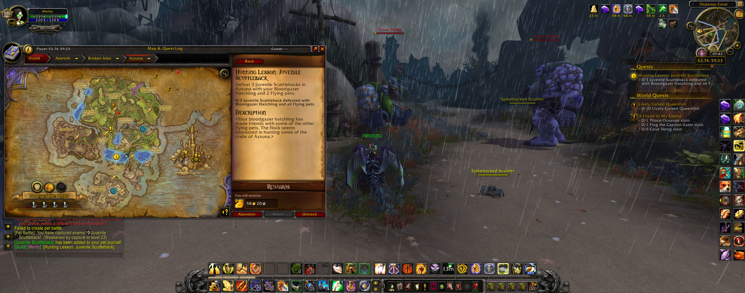 | Description | This quest " https://www.wowhead.com/quest=45010/hunting-lesson-juvenile-scuttleback " is bugged and can't be completed. The quest asks you to defeat https://www.wowhead.com/npc=97283/juvenile-scuttleback battle-pets in Azsuna while the https://www.wowhead.com/npc=115787/bloodgazer-hatchling is in the team with two other Flying Battle-pets. I've tried different aproaches with the https://www.wowhead.com/npc=115787/bloodgazer-hatchling in the team: - Win the battle - Win the battle with the https://www.wowhead.com/npc=115787/bloodgazer-hatchling summoned AND on team; - Win the battle while capturing the https://www.wowhead.com/npc=97283/juvenile-scuttleback with the https://www.wowhead.com/npc=115787/bloodgazer-hatchling on team AND summoned. Nothing works. As wowhead's comment says, it should work either killing or capturing the battle-pet, the important thing is to WIN the battle. Bellow, the screenshots trying to illustrate the problem Also, another annoying and frustrating bug I've encountered is that this chain quest resets sometimes. It happend twice, I had the quest and logged out, and the next day I had no quest and had to start all over again. | ||||