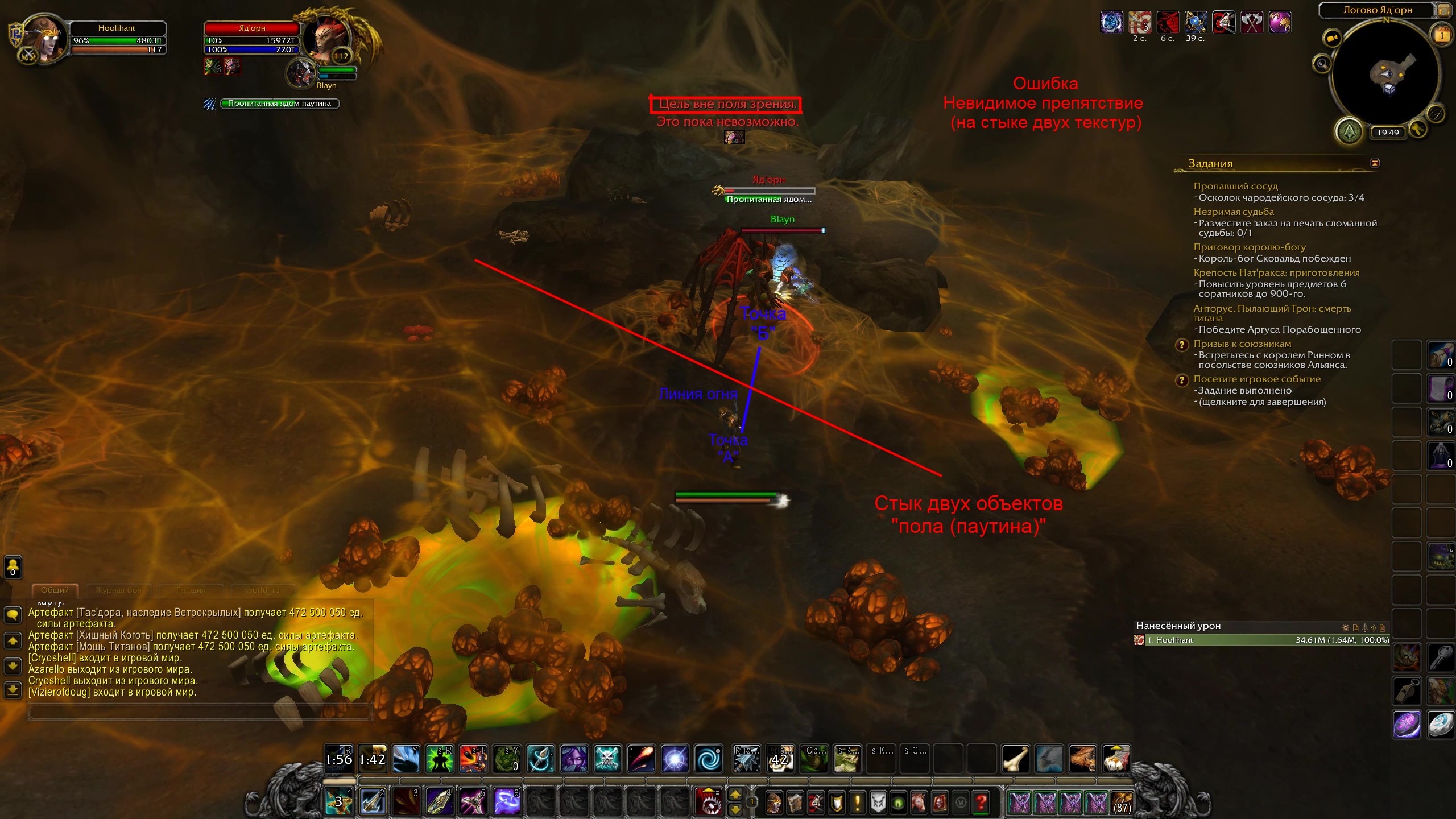 | Steps To Reproduce | 1. Запустить игру и войти на персонажа. 2. Прибежать в локацию «Логово Яд’орн». 3. Стать в точку «А» / Яд’орн в точке «Б»(её спавн). 4. Начать атаковать. 5. Получаем ошибку «Цель вне поля зрения». | ||||