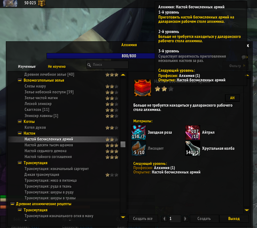 Мне, на скриншоте, прокнуло на 21 крафте. Но комментарии на вовхеде показывают, что шансы достаточно малы https://www.wowhead.com/ru/spell=188345/%D0%BD%D0%B0%D1%81%D1%82%D0%BE%D0%B9-%D0%B1%D0%B5%D1%81%D1%87%D0%B8%D1%81%D0%BB%D0%B5%D0%BD%D0%BD%D1%8B%D1%85-%D0%B0%D1%80%D0%BC%D0%B8%D0%B9#comments:id=2448910 This is the only flask that I still can't get Rank 3 on, even after more than 1500xFlask of the Countless Armies Flask of the Countless Armies made... My luck must be pretty bad by now, considering everything else required 300 flasks on average for a proc https://www.wowhead.com/ru/item=127950/рецепт-настой-бесчисленных-армий#english-comments Took me 2119 crafts to get the rank 3.... Fakk you RN Jesus! Like many others, I was unlucky with this one too, took me 1632 crafts Но я бы, на всякий случай, еще раз перепроверил сумки, банк и почту. |